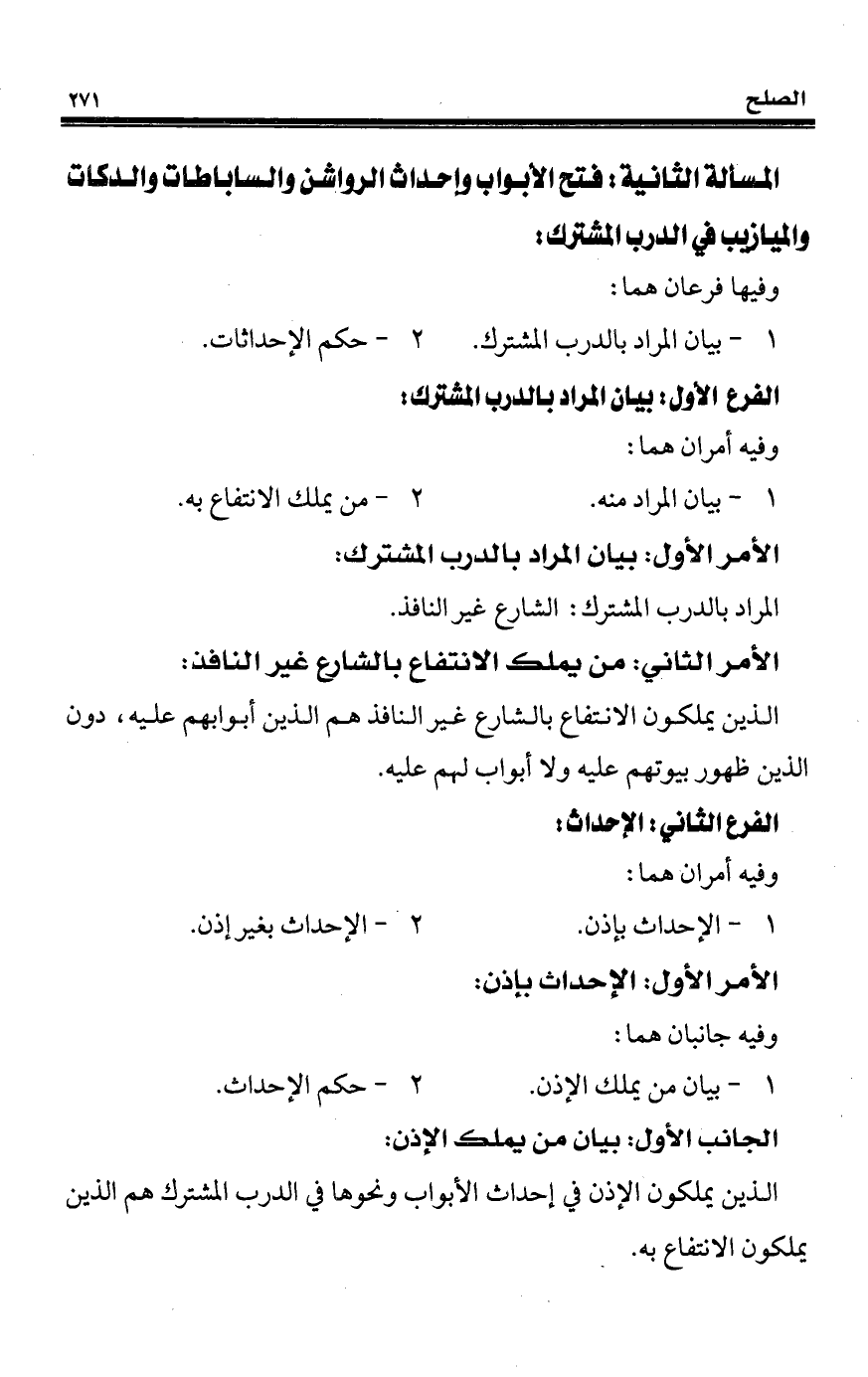 المسألة الثانية: فتح الأبواب وإحداث الرواشن والساباطات والدكات والميازيب في الدرب المشترك: