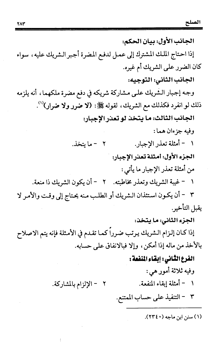 وجه إجبار الشريك على مشاركة شريكه في دفع مضرة ملكهما، أنه يلزمه ذلك لو انفرد فكذلك مع الشريك، لقوله - صلى الله عليه وسلم -: (لا ضرر ولا ضرار) (¬1).