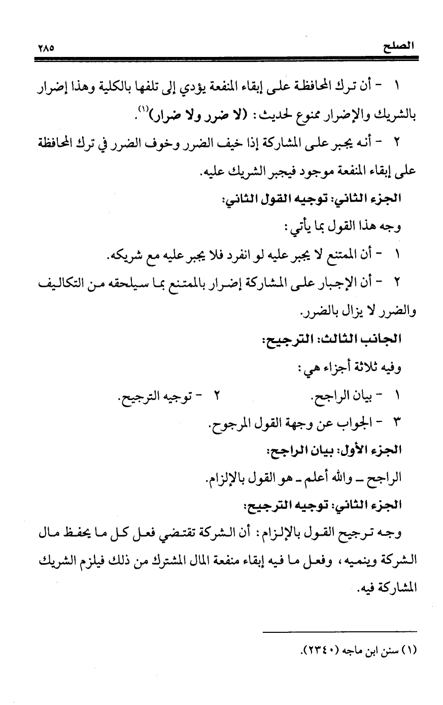 وجه ترجيح القول بالإلزام: أن الشركة تقتضي فعل كل ما يحفظ مال الشركة وينميه، وفعل ما فيه إبقاء منفعة المال المشترك من ذلك فيلزم الشريك المشاركة فيه.