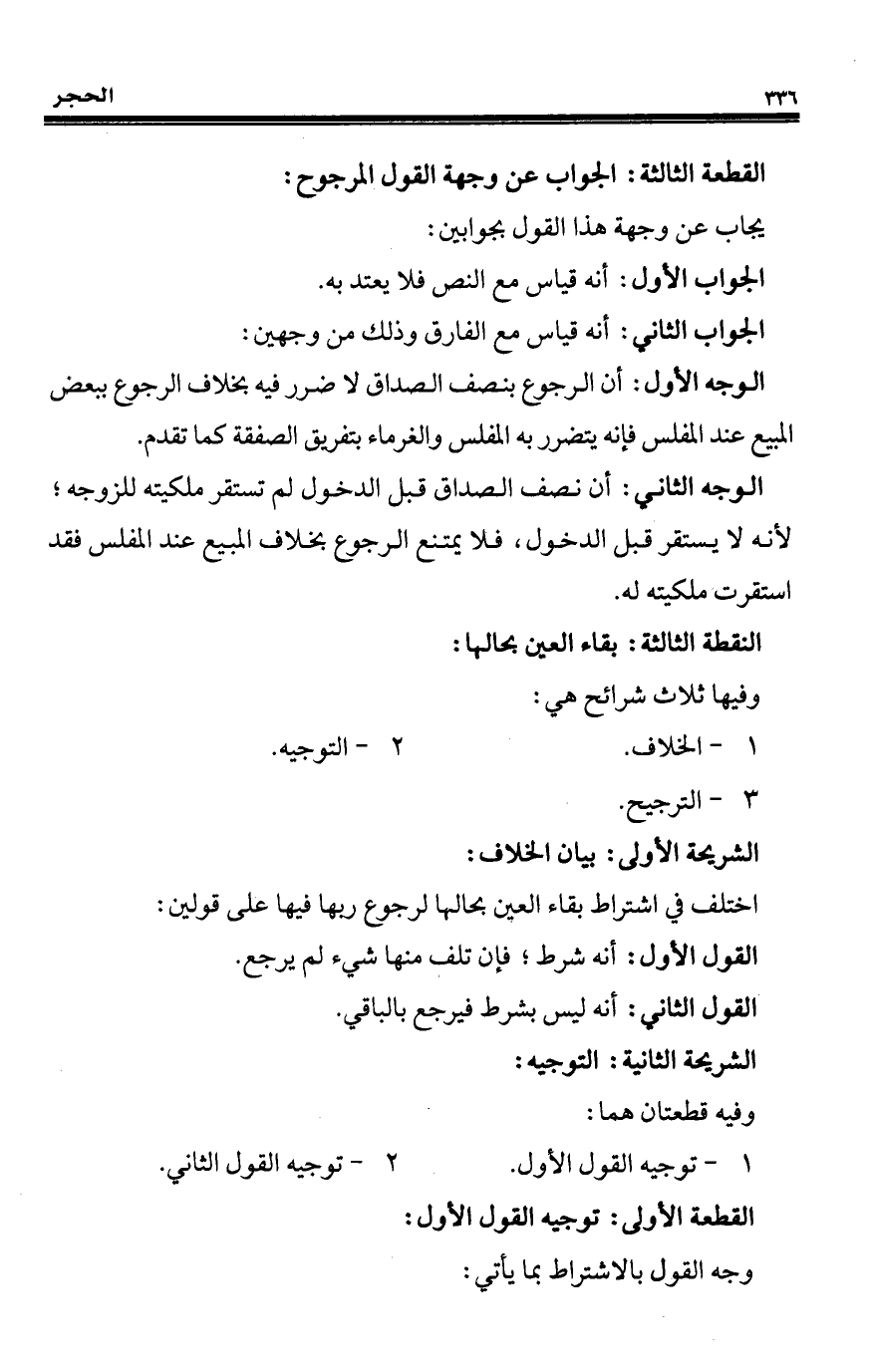 الوجه الثاني: أن نصف الصداق قبل الدخول لم تستقر ملكيته للزوجه؛ لأنه لا يستقر قبل الدخول، فلا يمتنع الرجوع بخلاف البيع عند المفلس فقد استقرت ملكيته له.
