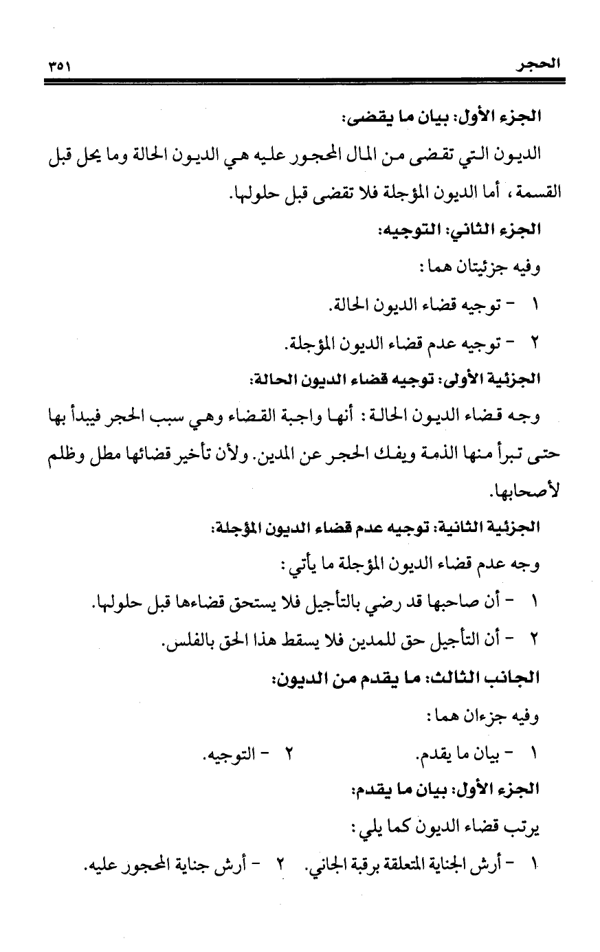 الديون التي تقضى من المال المحجور عليه هي الديون الحالة وما يحل قبل القسمة، أما الديون المؤجلة فلا تقضى قبل حلولها.