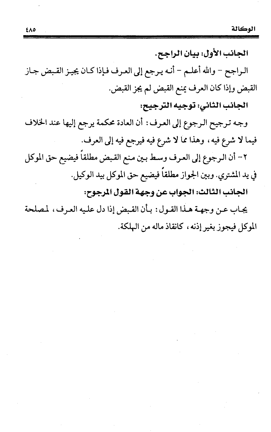 2 - أن الرجوع إلى العرف وسط بين منع القبض مطلقًا فيضيع حق الموكل في يد المشتري. وبين الجواز مطلقًا فيضيع حق الموكل بيد الوكيل.