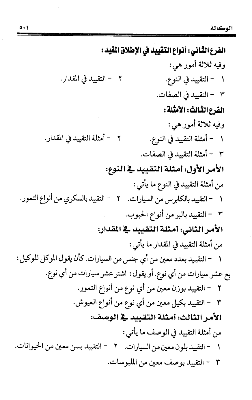 1 - التقييد بعدد معين من أي جنس من السيارات. كان يقول الموكل للوكيل: بع عشر سيارات من أي نوع. أو يقول: اشتر عشر سيارات من أي نوع.