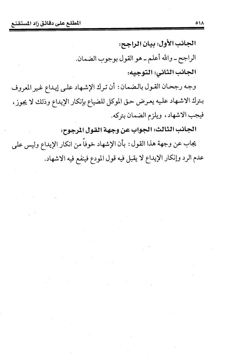 وجه رجحان القول بالضمان: أن ترك الإشهاد على إيداع غير المعروف بترك الإشهاد عليه يعرض حق الموكل للضياع بإنكار الإيداع وذلك لا يجوز، فيجب الإشهاد، ويلزم الضمان بتركه.