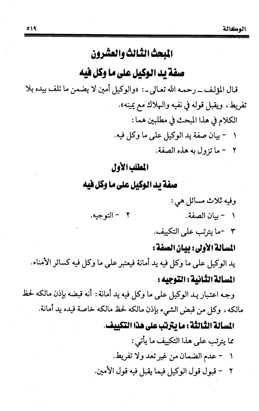 المبحث الثالث والعشرون صفة يد الوكيل على ما وكل فيه
