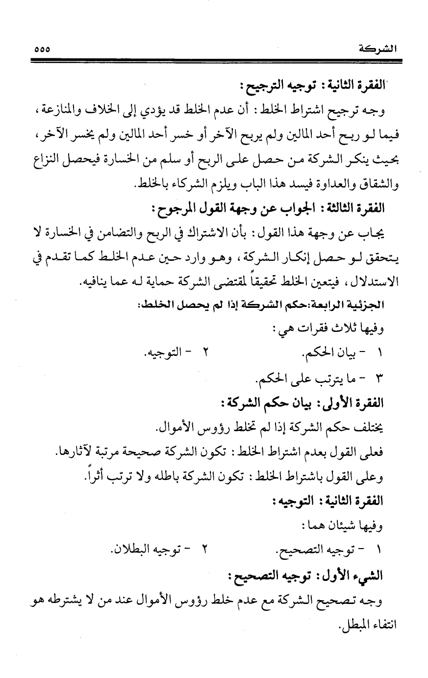 وجه ترجيح اشتراط الخلط: أن عدم الخلط قد يؤدي إلى الخلاف والمنازعة، فيما لو ربح أحد المالين ولم يربح الآخر أو خسر أحد المالين ولم يخسر الآخر، بحيث ينكر الشركة من حصل على الربح أو سلم من الخسارة فيحصل النزاع والشقاق والعداوة فيسد هذا الباب ويلزم الشركاء بالخلط.
