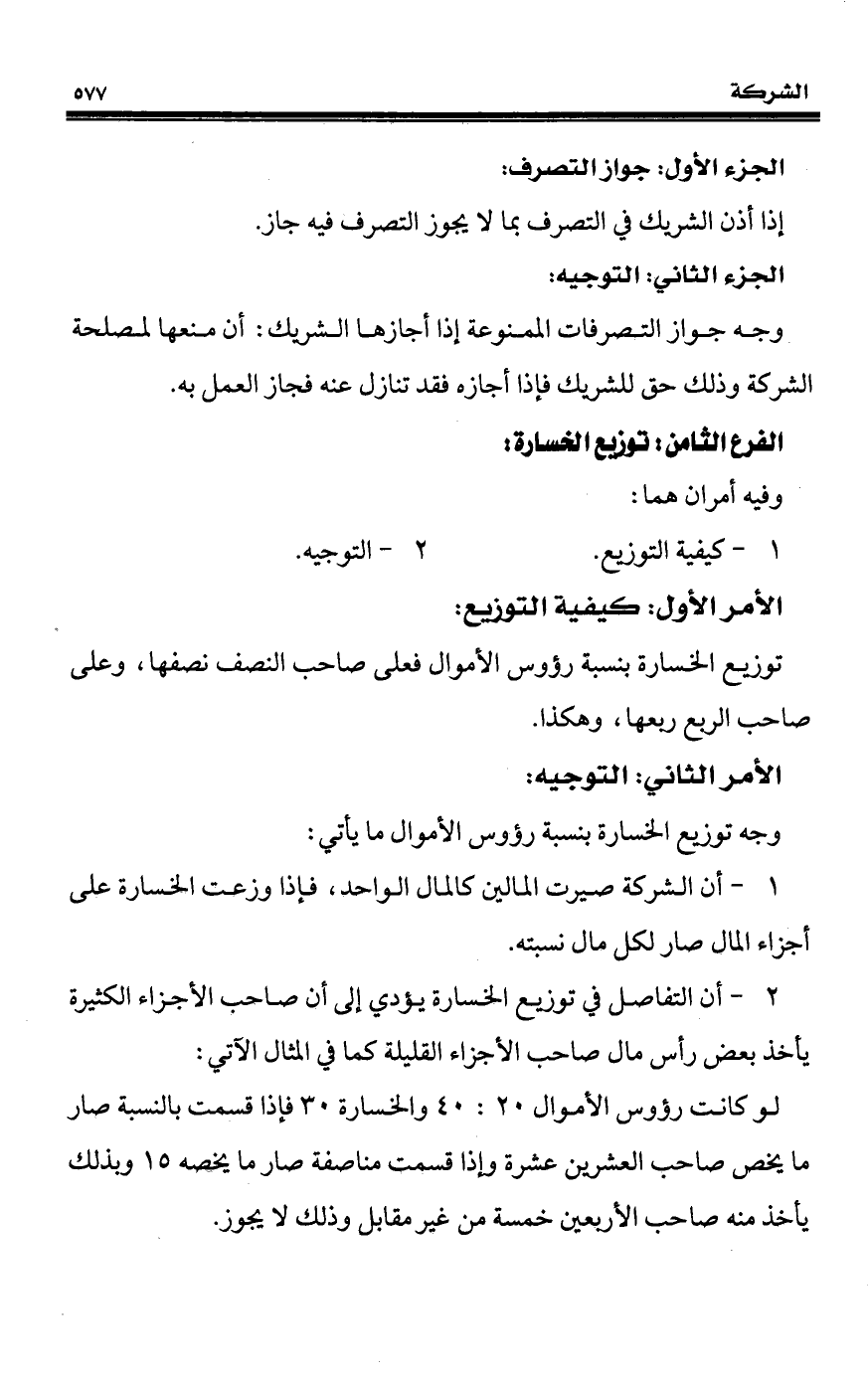 2 - أن التفاصل في توزيع الخسارة يؤدي إلى أن صاحب الأجزاء الكثيرة يأخذ بعض رأس مال صاحب الأجزاء القليلة كما في المثال الآتي: