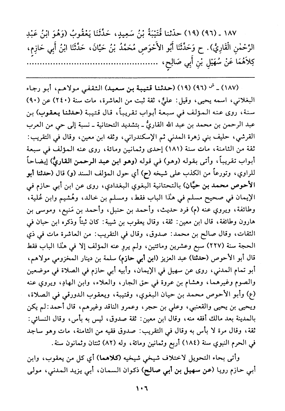 (١٨٧) - ش (٩٦) (١٩) (حَدَّثَنَا قتيبة بن سعيد) الثقفي مولاهم، أَبو رجاء البغلاني، اسمه يحيى، وقيل: على، ثقة ثبت من العاشرة، مات سنة (٢٤٠) عن (٩٠) سنة، روى عنه المؤلف في سبعة أَبواب تقريبًا، قال قتيبة (حَدَّثَنَا يعقوب) بن عبد الرحمن بن محمد بن عبد الله القاريُّ - بتشديد التحتانية - نسبة إلى حي من العرب القرشي، حليف بني زُهرة المدني ثم الإسكندراني، وثقه ابن معين، وقال في التقريب: ثقة من الثامنة، مات سنة (١٨١) إحدى وثمانين ومائة، روى عنه المؤلف في سبعة أَبواب تقريبًا، وأتى بقوله (وهو) في قوله (وهو ابن عبد الرحمن القاري) إيضاحًا للراوي، وتورعًا من الكذب على شيخه (خ) أي حول المؤلف السند (و) قال (حَدَّثَنَا أَبو الأحوص محمد بن حيَّان) بالتحتانية البغوي البغدادي، روى عن ابن أبي حازم في الإيمان في صحيح مسلم في هذا الباب فقط، ومسلم بن خالد، وهُشيم وابن عُلية، وطائفة، ويروي عنه (م) فرد حديث، وأحمد بن حنبل، وأحمد بن مَنيع، وموسى بن هارون وطائفة، قال ابن معين: ثقة، وقال يعقوب بن شيبة: كان ثبتًا وذكره ابن حبان في الثقات، وقال صالح بن محمد: صدوق، وقال في التقريب: من العاشرة مات في ذي الحجة سنة (٢٢٧) سبع وعشرين ومائتين، ولم يرو عنه المؤلف إلَّا في هذا الباب فقط قال أبو الأحوص (حَدَّثَنَا) عبد العزيز (ابن أبي حازم) سلمة بن دينار المخزومي مولاهم، أَبو تمام المدني، روى عن سهيل في الإيمان، وأبيه أبي حازم في الصلاة في موضعين والصوم وغيرهما، وهشام بن عروة في حق الجار، والعلاء، وابن الهادٍ، ويروي عنه (ع) وأَبو الأحوص محمد بن حيان البغوي، وقتيبة، ويعقوب الدورقي في الصلاة، ويحيى بن يحيى والقعنبي، وعلي بن حجر، وعمرو الناقد وغيرهم، قال أحمد: لم يكن بالمدينة بعد مالك أفقه منه، وقال ابن معين: ثقة صدوق، ليس به بأس، وقال النَّسائي: ثقة، وقال مرة لا بأس به وقال في التقريب: صدوق فقيه من الثامنة، مات وهو ساجد في الحرم النبوي سنة (١٨٤) أربع وثمانين ومائة، وله (٨٢) ثنتان وثمانون سنة.