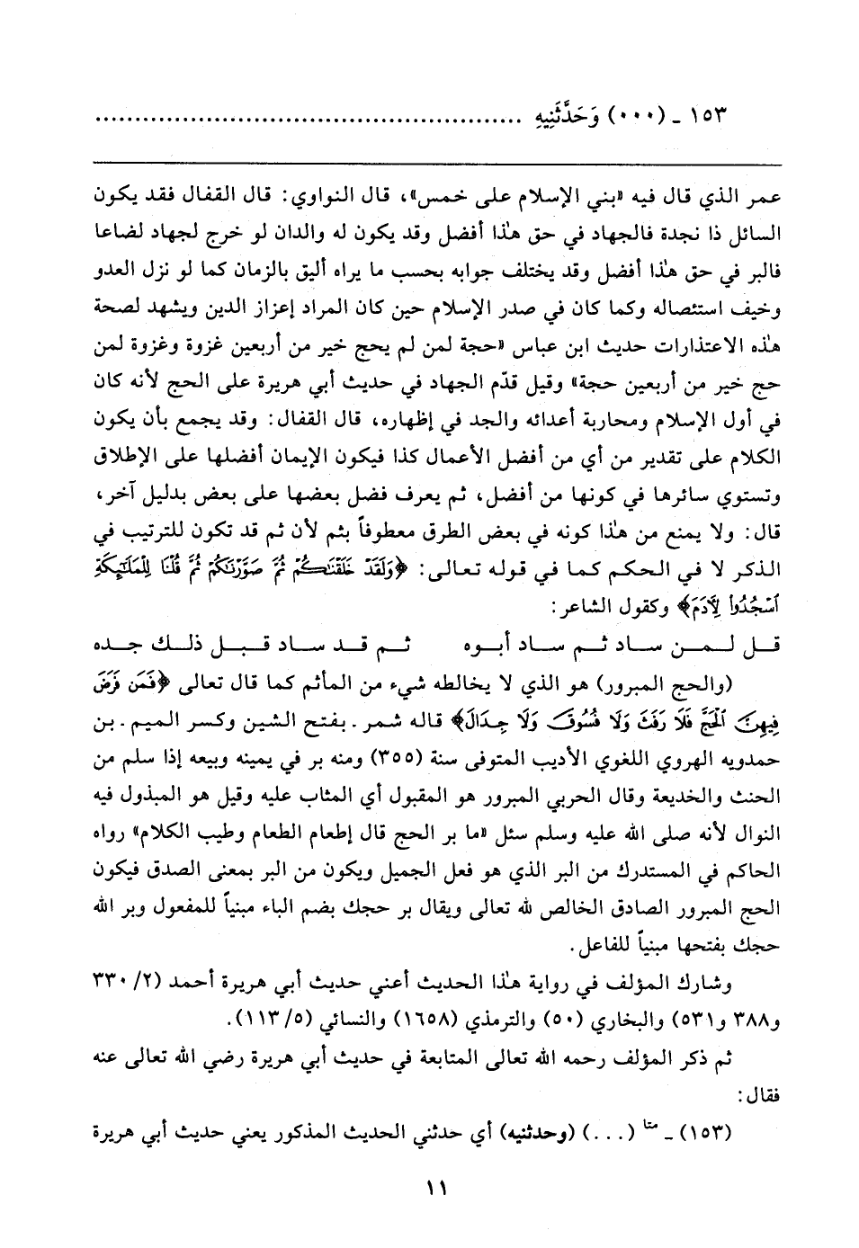 عمر الذي قال فيه "بني الإِسلام على خمس"، قال النواوي: قال القفال فقد يكون السائل ذا نجدة فالجهاد في حق هذا أفضل وقد يكون له والدان لو خرج لجهاد لضاعا فالبر في حق هذا أفضل وقد يختلف جوابه بحسب ما يراه أليق بالزمان كما لو نزل العدو وخيف استئصاله وكما كان في صدر الإِسلام حين كان المراد إعزاز الدين وشهد لصحة هذه الاعتذارات حديث ابن عباس "حجة لمن لم يحج خير من أربعين غزوة وغزوة لمن حج خير من أربعين حجة" وقيل قدّم الجهاد في حديث أبي هريرة على الحج لأنه كان في أول الإِسلام ومحاربة أعدائه والجد في إظهاره، قال القفال: وقد يجمع بأن يكون الكلام على تقدير من أي من أفضل الأعمال كذا فيكون الإيمان أفضلها على الإطلاق وتستوي سائرها في كونها من أفضل، ثم يعرف فضل بعضها على بعض بدليل آخر، قال: ولا يمنع من هذا كونه في بعض الطرق معطوفًا بثم لأن ثم قد تكون للترتيب في الذكر لا في الحكم كما في قوله تعالى: {وَلَقَدْ خَلَقْنَاكُمْ ثُمَّ صَوَّرْنَاكُمْ ثُمَّ قُلْنَا لِلْمَلَائِكَةِ اسْجُدُوا لِآدَمَ} وكقول الشاعر: