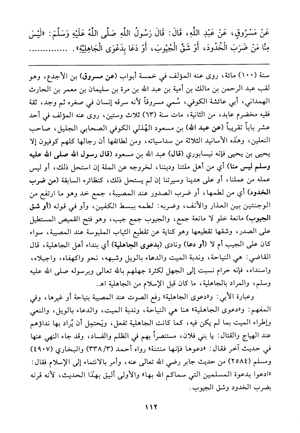 عَنْ مَسْرُوقٍ، عَنْ عَبْدِ اللهِ، قَال: قَال رَسُولُ اللهِ صَلَّى اللهُ عَلَيهِ وَسَلَّمَ: "لَيسَ مِنَّا مَنْ ضَرَبَ الْخُدُودَ، أَوْ شَقَّ الْجُيُوبَ، أَوْ دَعَا بِدَعْوَى الْجَاهِلِيَّةِ"