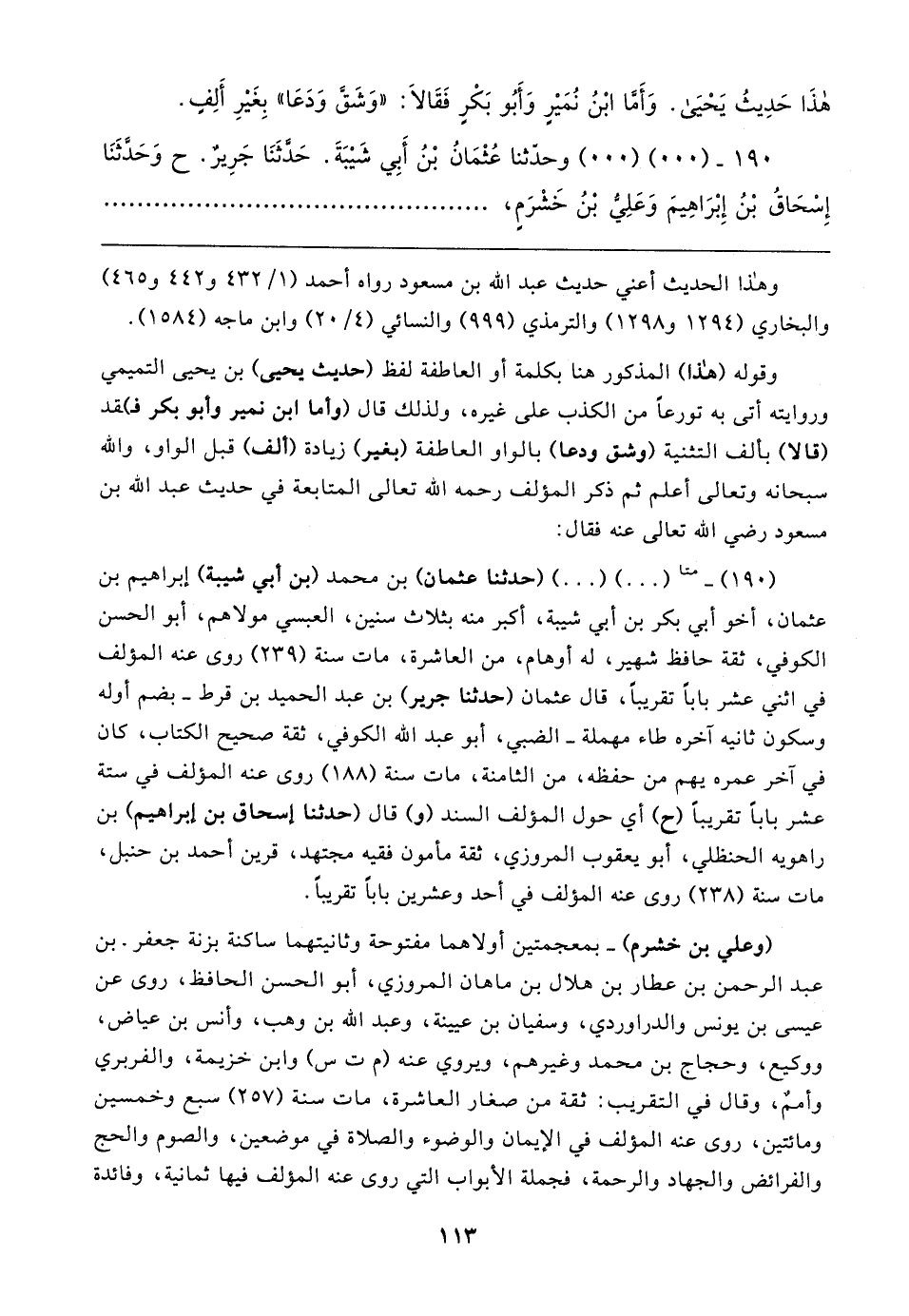(١٩٠) - متا (٠٠) (٠٠) (حَدَّثَنَا عثمان) بن محمد (بن أبي شيبة) إبراهيم بن عثمان، أخو أبي بكر بن أبي شيبة، أكبر منه بثلاث سنين، العبسي مولاهم، أَبو الحسن الكوفي، ثقة حافظ شهير، له أوهام، من العاشرة، مات سنة (٢٣٩) روى عنه المؤلف في اثني عشر بابًا تقريبًا، قال عثمان (حَدَّثَنَا جرير) بن عبد الحميد بن قرط -بضم أوله وسكون ثانيه آخره طاء مهملة- الضبي، أَبو عبد الله الكوفي، ثقة صحيح الكتاب، كان في آخر عمره يهم من حفظه، من الثامنة، مات سنة (١٨٨) روى عنه المؤلف في ستة عشر بابًا تقريبًا (ح) أي حول المؤلف السند (و) قال (حَدَّثَنَا إسحاق بن إبراهيم) بن راهويه الحنظلي، أَبو يعقوب المروزي، ثقة مأمون فقيه مجتهد، قرين أحمد بن حنبل، مات سنة (٢٣٨) روى عنه المؤلف في أحد وعشرين بابًا تقريبًا.