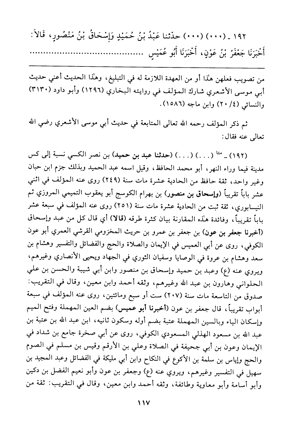 ١٩٢ - (٠٠) (٠٠) حَدَّثَنَا عَبْدُ بْنُ حُمَيدٍ وَإِسْحَاقُ بْنُ مَنْصُورٍ، قَالا: أَخْبَرَنَا جَعْفَرُ بْنُ عَوْنٍ، أَخْبَرَنَا أَبُو عُمَيسٍ