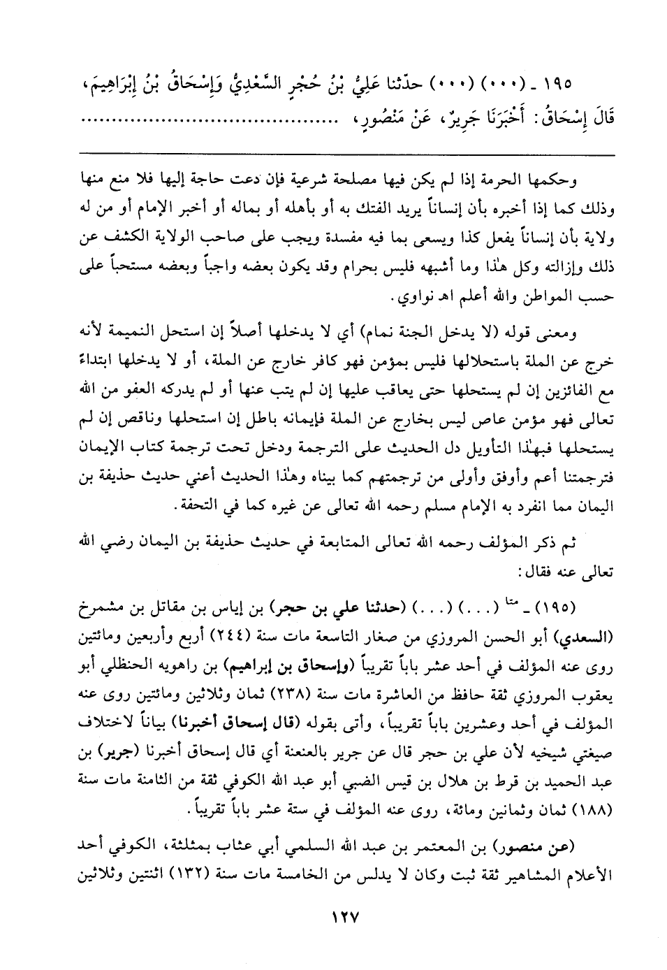 ١٩٥ - (٠٠) (٠٠) حَدَّثَنَا عَلِيُّ بْنُ حُجْرٍ السَّعْدِيُّ وَإِسْحَاقُ بْنُ إِبْرَاهِيمَ، قَال إِسْحَاقُ: أَخْبَرَنَا جَرِيرٌ، عَنْ مَنْصُورٍ،