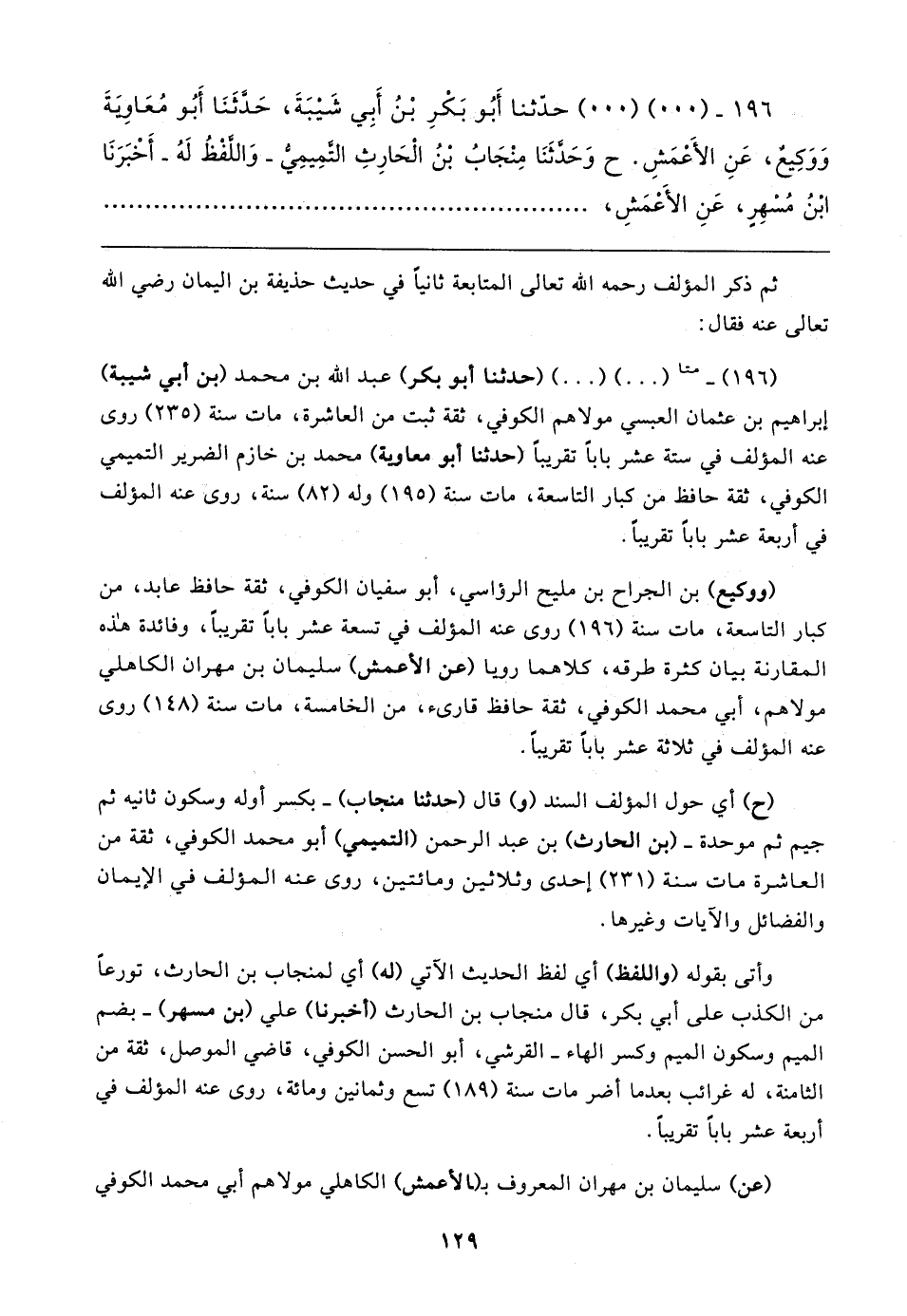 (١٩٦) - متا (٠٠) (٠٠) (حَدَّثَنَا أَبو بكر) عبد الله بن محمد (بن أبي شيبة) إبراهيم بن عثمان العبسي مولاهم الكوفي، ثقة ثبت من العاشرة، مات سنة (٢٣٥) روى عنه المؤلف في ستة عشر بابًا تقريبًا (حَدَّثَنَا أَبو معاوية) محمد بن خازم الضرير التميمي الكوفي، ثقة حافظ من كبار التاسعة، مات سنة (١٩٥) وله (٨٢) سنة، روى عنه المؤلف في أربعة عشر بابًا تقريبًا.