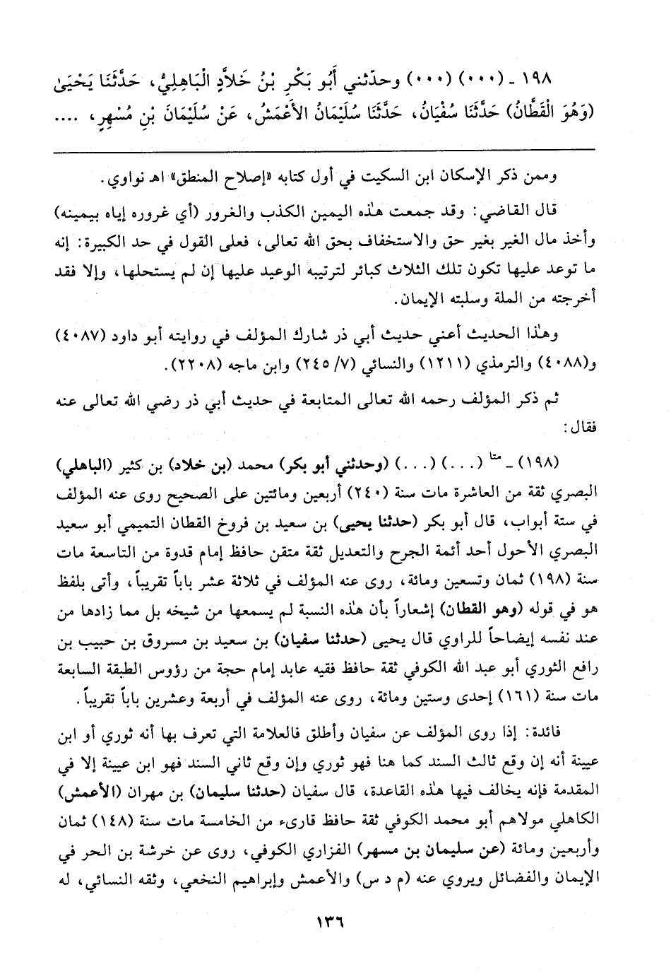 (١٩٨) - متا (٠٠) (٠٠) (وحدثني أَبو بكر) محمد (بن خلاد) بن كثير (الباهلي) البصري ثقة من العاشرة مات سنة (٢٤٥) أربعين ومائتين على الصحيح روى عنه المؤلف في ستة أَبواب، قال أَبو بكر (حَدَّثَنَا يحيى) بن سعيد بن فروخ القطان التميمي أَبو سعيد البصري الأحول أحد أئمة الجرح والتعديل ثقة متقن حافظ إمام قدوة من التاسعة مات سنة (١٩٨) ثمان وتسعين ومائة، روى عنه المؤلف في ثلاثة عشر بابًا تقريبًا، وأتى بلفظ هو في قوله (وهو القطان) إشعارًا بأن هذه النسبة لم يسمعها من شيخه بل مما زادها من عند نفسه إيضاحًا للراوي قال يحيى (حَدَّثَنَا سفيان) بن سعيد بن مسروق بن حبيب بن رافع الثَّوري أَبو عبد الله الكوفي ثقة حافظ فقيه عابد إمام حجة من رؤوس الطبقة السابعة مات سنة (١٦١) إحدى وستين ومائة، روى عنه المؤلف في أربعة وعشرين بابًا تقريبًا.