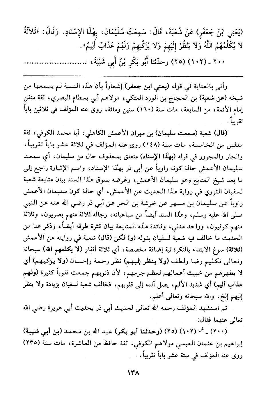 (يَعْنِي ابْنَ جَعْفَرٍ) عَن شُعْبَةَ، قَال: سَمِعْتُ سُلَيمَانَ، بِهَذَا الإِسْنَادِ. وَقَال: "ثَلَاثَةٌ لا يُكَلِّمُهُمُ اللهُ وَلا يَنْظُرُ إِلَيهِمْ وَلا يُزَكِّيهِمْ وَلَهُمْ عَذَابٌ أَلِيمٌ".