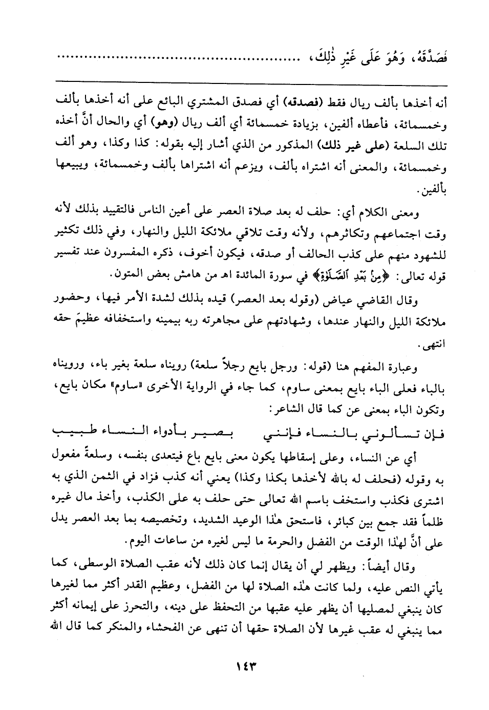 ومعنى الكلام أي: حلف له بعد صلاة العصر على أعين الناس فالتقييد بذلك لأنه وقت اجتماعهم وتكاثرهم، ولأنه وقت تلاقي ملائكة الليل والنهار، وفي ذلك تكثير للشهود منهم على كذب الحالف أو صدقه، فيكون أخوف، ذكره المفسرون عند تفسير قوله تعالى: {مِنْ بَعْدِ الصَّلَاةِ} في سورة المائدة اهـ من هامش بعض المتون.