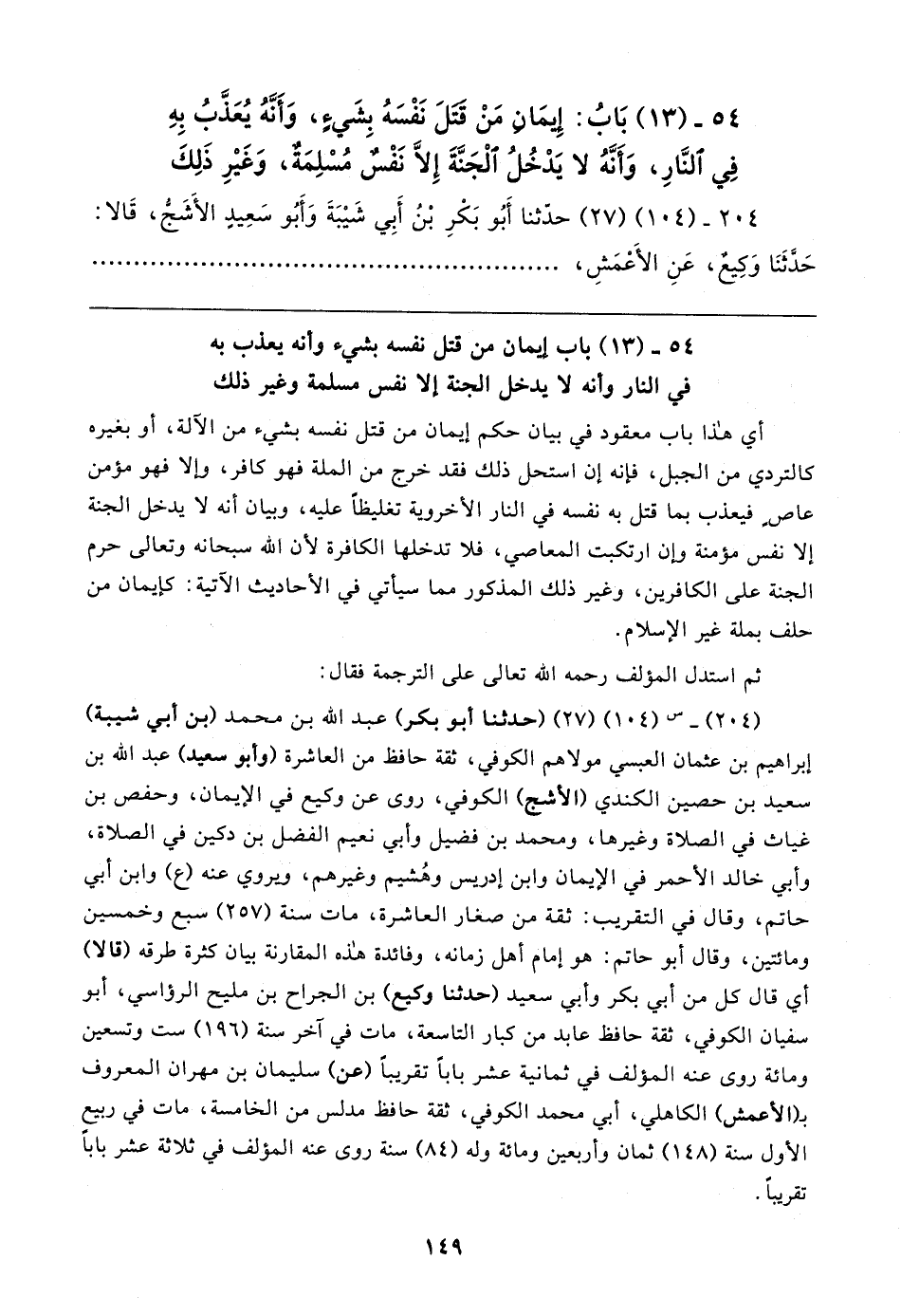 ٥٤ - (١٣) بَابُ: إِيمَانِ مَنْ قتَلَ نَفْسَهُ بِشَيءٍ، وَأَنَّهُ يُعَذَّبُ بِهِ فِي النَّارٍ، وَأَنَّهُ لَا يَدْخُلُ الْجَنَّةَ إلا نَفْسٌ مُسْلِمَةٌ، وَغَيرِ ذَلِكَ