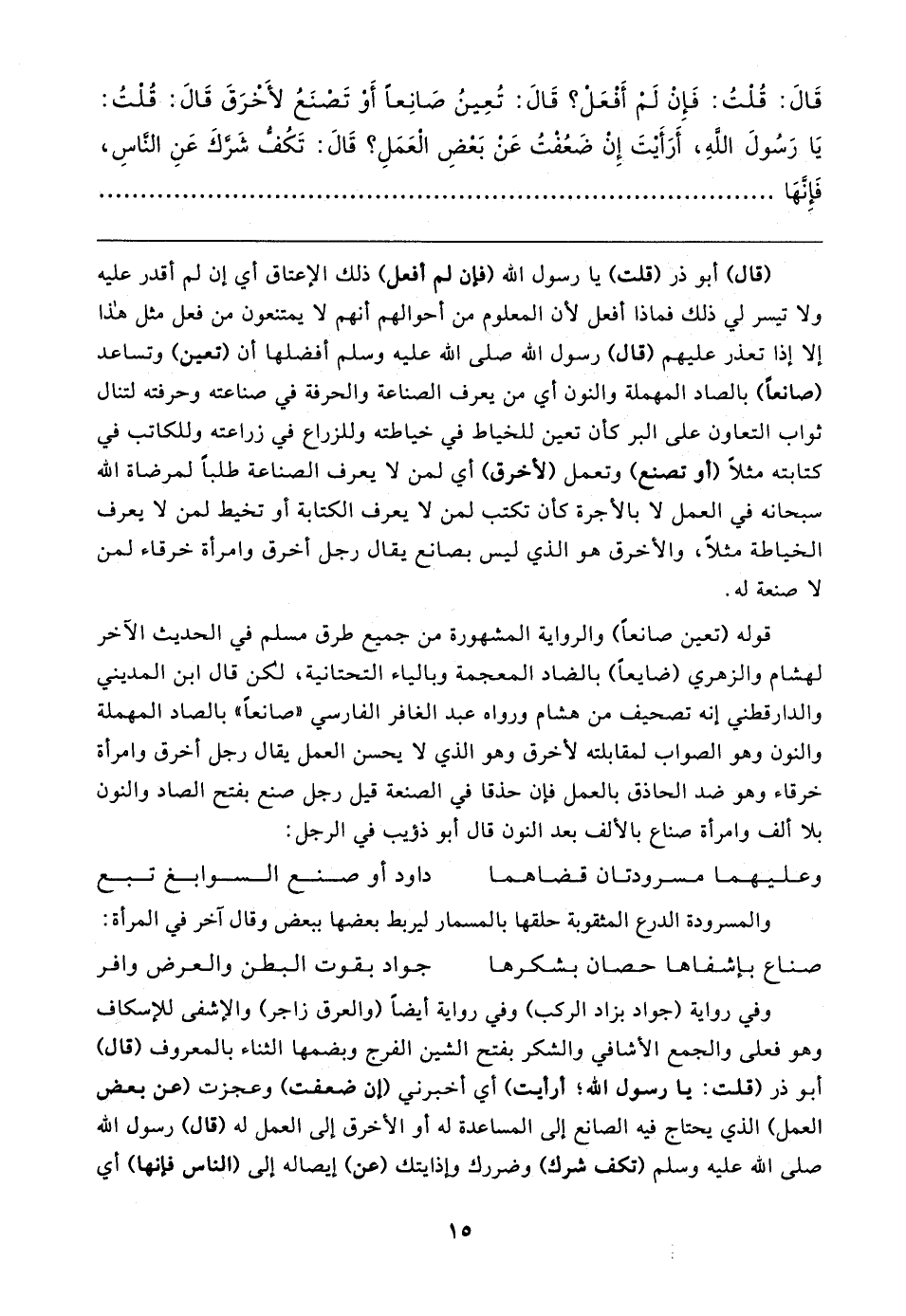 قَال: قُلْتُ: فَإِنْ لَمْ أَفْعَل؟ قَال: تُعِينُ صَانِعًا أَوْ تَصْنَعُ لأخَرَقَ قَال: قُلْتُ: يَا رَسُولَ اللهِ، أَرَأَيتَ إن ضَعُفْتُ عَنْ بَعْضِ العَمَلِ؟ قَال: تَكُفُّ شَرَّكَ عَنِ الناسِ، فَإِنَّهَا