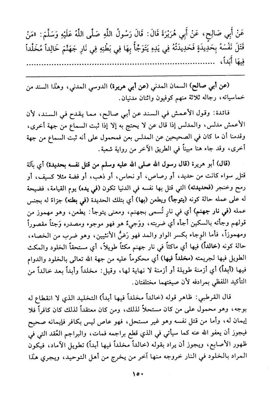 عَنْ أَبِي صَالِحٍ، عَنْ أَبِي هُرَيرَةَ قَال: قَال رَسُولُ اللهِ صَلَّى اللهُ عَلَيهِ وَسَلَّمَ: "مَنْ قَتَلَ نَفْسَهُ بِحَدِيدَةٍ فَحَدِيدَتُهُ فِي يَدِهِ يَتَوَجَّأُ بِهَا فِي بَطْنِهِ فِي نَارِ جَهَنَّمَ خَالِدًا مُخَلَّدًا فِيهَا أَبَدًا،