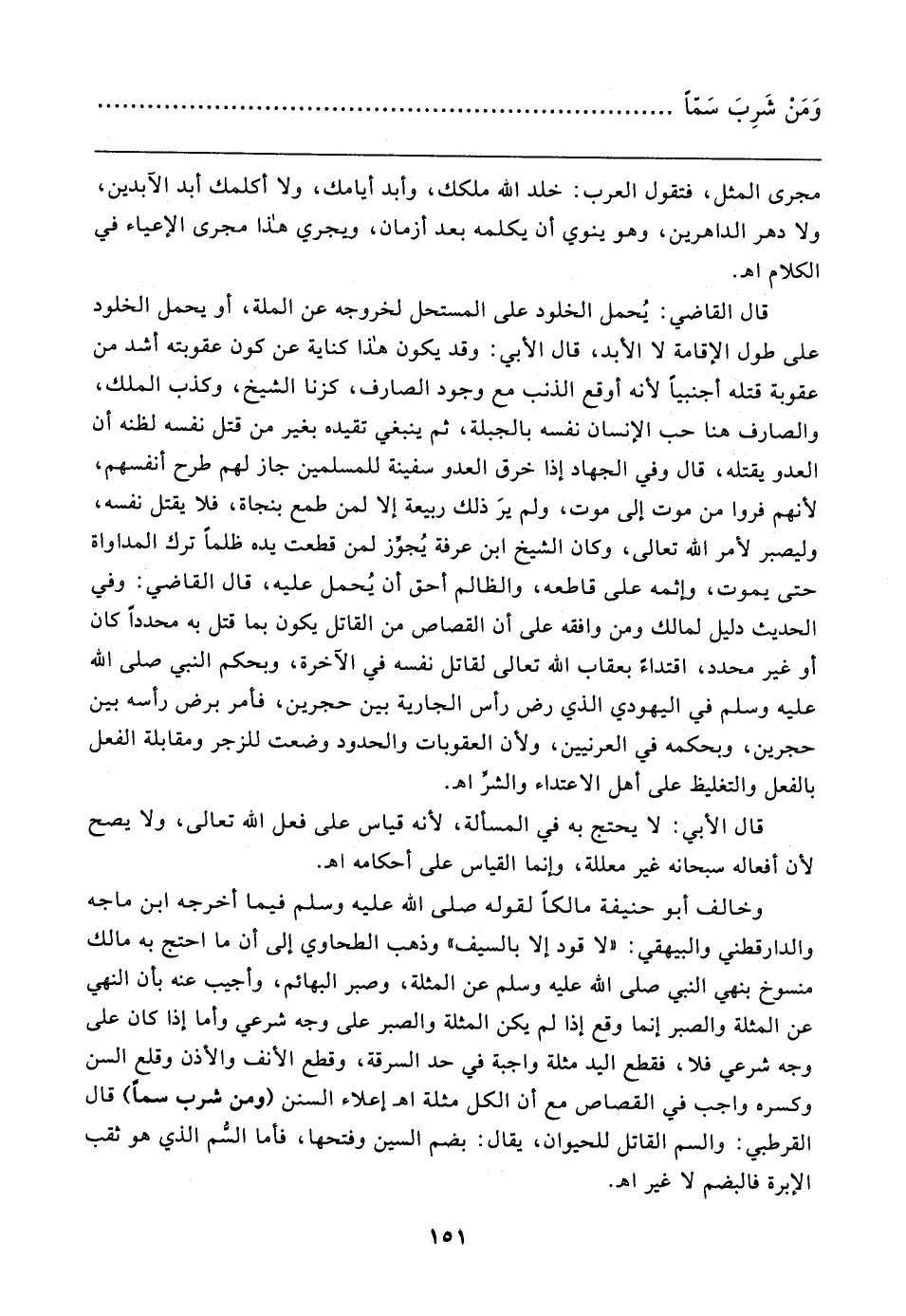وخالف أبو حنيفة مالكًا لقوله صلى الله عليه وسلم فيما أخرجه ابن ماجه والدارقطني والبيهقي: "لا قود إلا بالسيف" وذهب الطحاوي إلى أن ما احتج به مالك منسوخ بنهي النبي صلى الله عليه وسلم عن المثلة، وصبر البهائم، وأجيب عنه بأن النهي عن المثلة والصبر إنما وقع إذا لم يكن المثلة والصبر على وجه شرعي وأما إذا كان على وجه شرعي فلا، فقطع اليد مثلة واجبة في حد السرقة، وقطع الأنف والأذن وقلع السن وكسره واجب في القصاص مع أن الكل مثلة اهـ إعلاء السنن (ومن شرب سمًا) قال القرطبي: والسم القاتل للحيوان، يقال: بضم السين وفتحها، فأما السُّم الذي هو ثقب الإبرة فالبضم لا غير اهـ.