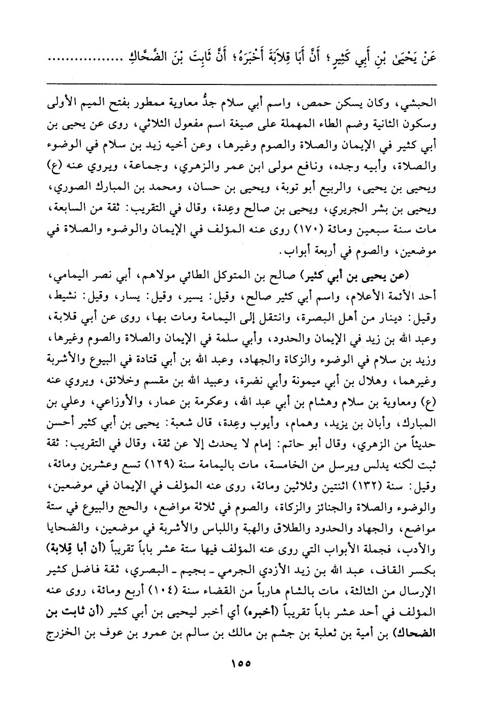 (عن يحيى بن أبي كثير) صالح بن المتوكل الطائي مولاهم، أبي نصر اليمامي، أحد الأئمة الأعلام، واسم أبي كثير صالح، وقيل: يسير، وقيل: يسار، وقيل: نشيط، وقيل: دينار من أهل البصرة، وانتقل إلى اليمامة ومات بها، روى عن أبي قلابة، وعبد الله بن زيد في الإيمان والحدود، وأبي سلمة في الإيمان والصلاة والصوم وغيرها، وزيد بن سلام في الوضوء والزكاة والجهاد، وعبد الله بن أبي قتادة في البيوع والأشربة وغيرهما، وهلال بن أبي ميمونة وأبي نضرة، وعبيد الله بن مقسم وخلائق، ويروي عنه (ع) ومعاوية بن سلام وهشام بن أبي عبد الله، وعكرمة بن عمار، والأوزاعي، وعلي بن المبارك، وأبان بن يزيد، وهمام، وأيوب وعِدة، قال شعبة: يحيى بن أبي كثير أحسن حديثًا من الزهري، وقال أبو حاتم: إمام لا يحدث إلا عن ثقة، وقال في التقريب: ثقة ثبت لكنه يدلس ويرسل من الخامسة، مات باليمامة سنة (١٢٩) تسع وعشرين ومائة، وقيل: سنة (١٣٢) اثنتين وثلاثين ومائة، روى عنه المؤلف في الإيمان في موضعين، والوضوء والصلاة والجنائز والزكاة، والصوم في ثلاثة مواضع، والحج والبيوع في ستة مواضع، والجهاد والحدود والطلاق والهبة واللباس والأشربة في موضعين، والضحايا والأدب، فجملة الأبواب التي روى عنه المؤلف فيها ستة عشر بابًا تقريبًا (أن أبا قِلابة) بكسر القاف، عبد الله بن زيد الأزدي الجرمي -بجيم- البصري، ثقة فاضل كثير الإرسال من الثالثة، مات بالشام هاربًا من القضاء سنة (١٠٤) أربع ومائة، روى عنه المؤلف في أحد عشر بابًا تقريبًا (أخبره) أي أخبر ليحيى بن أبي كثير (أن ثابت بن الضحاك) بن أمية بن ثعلبة بن جشم بن مالك بن سالم بن عمرو بن عوف بن الخزرج
