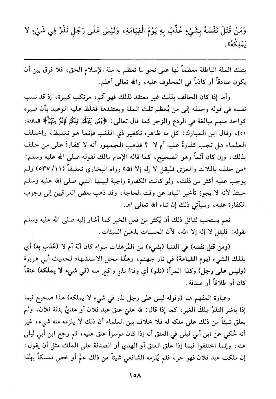 وَمَنْ قَتَلَ نَفْسَهُ بِشَيءٍ عُذِّبَ بِهِ يَوْمَ الْقِيَامَةِ، وَلَيسَ عَلَى رَجُلٍ نَذْرٌ فِي شَيءٍ لا يَمْلِكُهُ"
