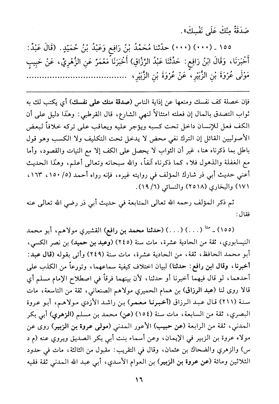 (١٥٥) - متا (٠٠) (٠٠) (حدثنا محمَّد بن رافع) القشيري مولاهم، أبو محمَّد النَّيسَابُورِيّ، ثِقَة من الحادية عشرة، مات سنة (٢٤٥) (وعبد بن حميد) بن نصر الكسي، أبو محمَّد الحافظ، ثِقَة، من الحادية عشرة، مات سنة (٢٤٩) وأتى بقوله (قال عبد: أخبرنا، وقال ابن رافع: حَدَّثَنَا) لبيان اختلاف كيفية سماعهما، وتورعًا من الكذب على أحدهما، لو قال بها أخبرنا أو حَدَّثَنَا, لأن بينهما فرقًا في اصطلاح الإِمام مسلم أي قالا روى لنا (عبد الرَّزّاق) بن همام الحميري مولاهم الصَّنْعانِيّ، ثِقَة من التاسعة، مات سنة (٢١١) قال عبد الرَّزّاق (أخبرنا معمر) بن راشد الأَزدِيّ مولاهم، أبو عروة البَصْرِيّ، ثِقَة من السابعة، مات سنة (١٥٤) (عن) محمَّد بن مسلم (الزُّهْرِيّ) أبي بكر المدنِيُّ، ثِقَة من الرابعة (عن حبيب) الأعور المدنِيُّ (مولى عروة بن الزبير) روى عن مولاه عروة بن الزُّبير في الإيمان, وعن أسماء بنت أبي بكر الصديق ويروي عنه (م د س) والزهري والضَّحَاك بن عثمان، وقال في التقريب: مقبول من الثالثة، مات في حدود الثلاثين ومائة (عن عروة بن الزُّبير) بن العوام الأسدي، أبي عبد الله المدنِيُّ ثِقَة فقيه