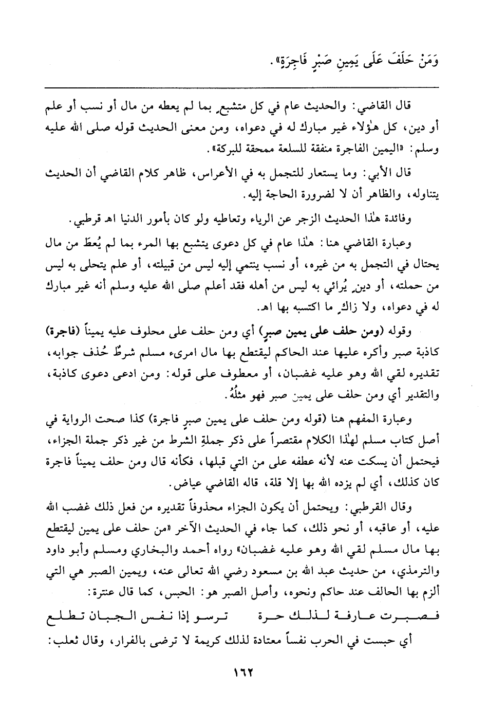 وعبارة المفهم هنا (قوله ومن حلف على يمين صبرٍ فاجرة) كذا صحت الرواية في أصل كتاب مسلم لهذا الكلام مقتصرًا على ذكر جملةِ الشرط من غير ذكر جملة الجزاء، فيحتمل أن يسكت عنه لأنه عطفه على من التي قبلها، فكأنه قال ومن حلف يمينًا فاجرة كان كذلك، أي لم يزده الله بها إلا قلة، قاله القاضي عياض.