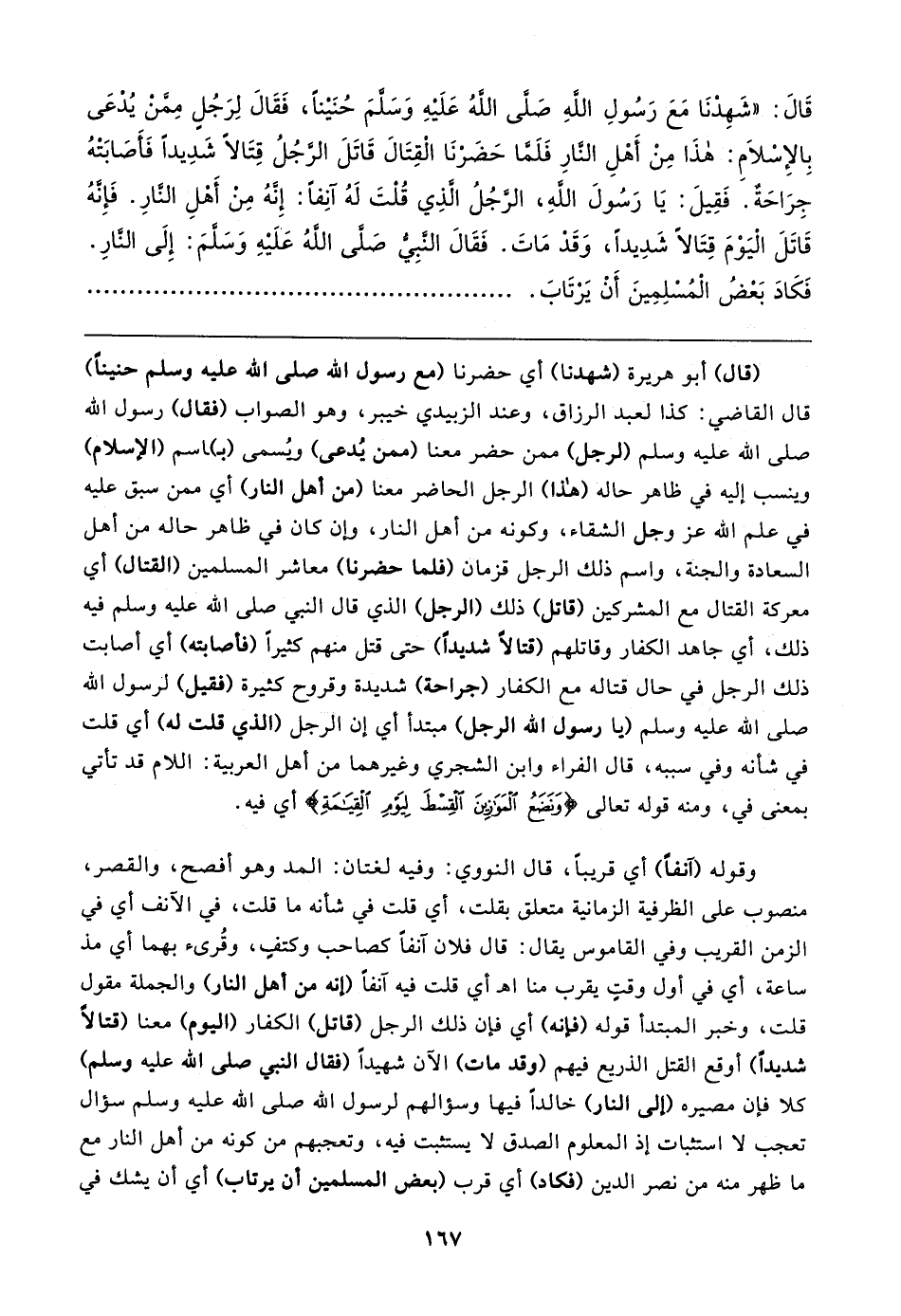وقوله (آنفًا) أي قريبًا، قال النووي: وفيه لغتان: المد وهو أفصح، والقصر، منصوب على الظرفية الزمانية متعلق بقلت، أي قلت في شأنه ما قلت، في الآنف أي في الزمن القريب وفي القاموس يقال: قال فلان آنفًا كصاحب وكتفٍ، وقُرئ بهما أي مذ ساعة، أي في أول وقتٍ يقرب منا اهـ أي قلت فيه آنفًا (إنه من أهل النار) والجملة مقول قلت، وخبر المبتدأ قوله (فإنه) أي فإن ذلك الرجل (قاتل) الكفار (اليوم) معنا (قتالًا شديدًا) أوقع القتل الذريع فيهم (وقد مات) الآن شهيدًا (فقال النبي صلى الله عليه وسلم) كلا فإن مصيره (إلى النار) خالدًا فيها وسؤالهم لرسول الله صلى الله عليه وسلم سؤال تعجب لا استثبات إذ المعلوم الصدق لا يستثبت فيه، وتعجبهم من كونه من أهل النار مع ما ظهر منه من نصر الدين (فكاد) أي قرب (بعض المسلمين أن يرتاب) أي أن يشك في