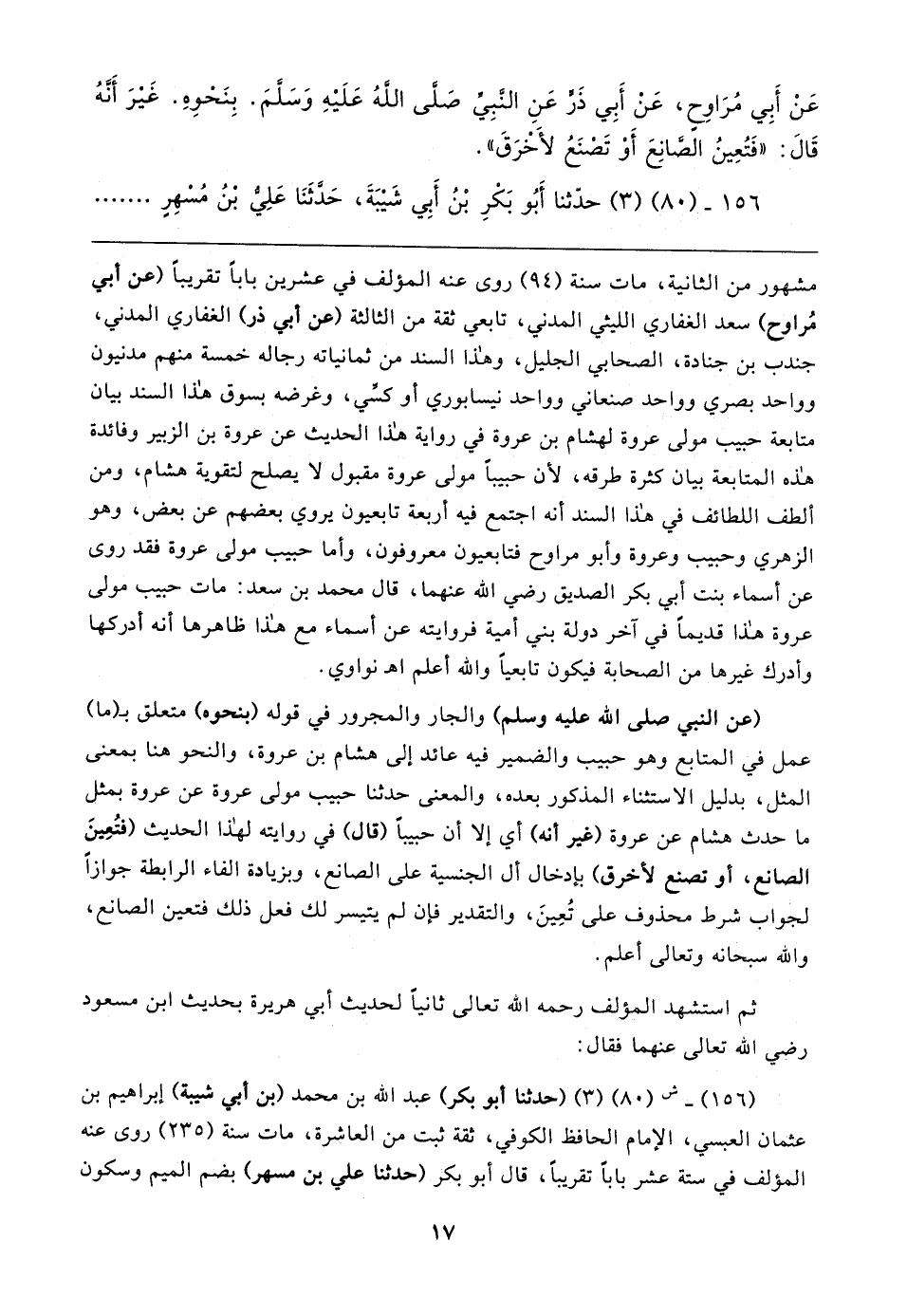 (١٥٦) - ش (٨٠) (٣) (حَدَّثَنَا أبو بكر) عبد الله بن محمَّد (بن أبي شيبة) إبراهيم بن عثمان العبسي، الإِمام الحافظ الكُوفيّ، ثِقَة ثبت من العاشرة، مات سنة (٢٣٥) روى عنه المؤلف في ستة عشر بابًا تقريبًا، قال أبو بكر (حَدَّثَنَا علي بن مسهر) بضم الميم وسكون