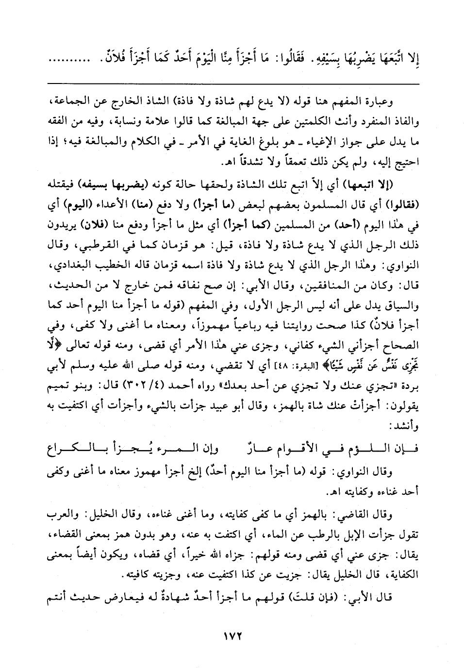 وقال القاضي: بالهمز أي ما كفى كفايته، وما أغنى غناءه، وقال الخليل: والعرب تقول جزأت الإبل بالرطب عن الماء، أي اكتفت به عنه، وهو بدون همز بمعنى القضاء، يقال: جزى عني أي قضى ومنه قولهم: جزاه الله خيرًا، أي قضاه، ويكون أيضًا بمعنى الكفاية، قال الخليل يقال: جزيت عن كذا اكتفيت عنه، وجزيته كافيته.