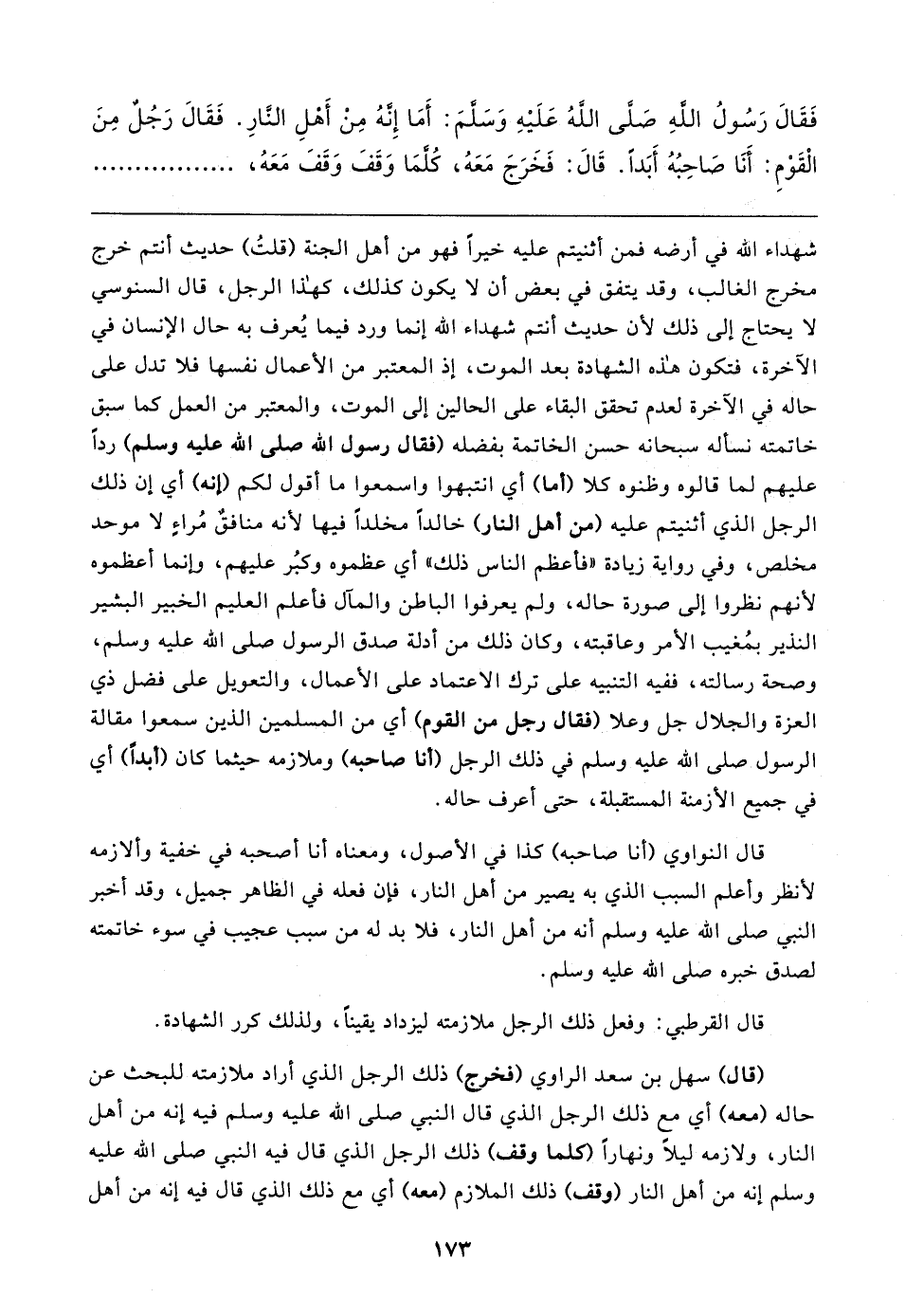 فَقَال رَسُولُ الله صَلَّى اللهُ عَلَيهِ وَسَلَّمَ: أَمَا إِنَّهُ مِنْ أَهْلِ النَّارِ. فَقَال رَجُلٌ مِنَ الْقَوْمِ: أَنَا صَاحِبُهُ أَبَدًا. قَال: فَخَرَجَ مَعَهُ، كُلَّمَا وَقَفَ وَقَفَ مَعَهُ،