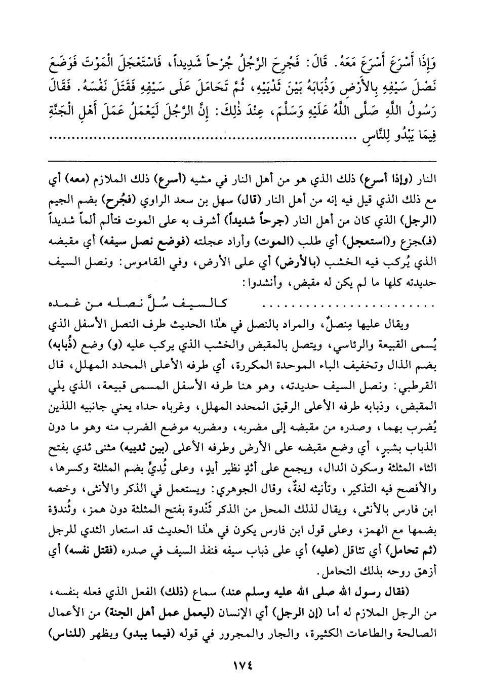 النار (وإذا أسرع) ذلك الذي هو من أهل النار في مشيه (أسرع) ذلك الملازم (معه) أي مع ذلك الذي قيل فيه إنه من أهل النار (قال) سهل بن سعد الراوي (فجُرح) بضم الجيم (الرجل) الذي كان من أهل النار (جرحًا شديدًا) أشرف به على الموت فتألم ألمًا شديدًا (فـ) ـجزع و (استعجل) أي طلب (الموت) وأراد عجلته (فوضع نصل سيفه) أي مقبضه الذي يُركب فيه الخشب (بالأرض) أي على الأرض، وفي القاموس: ونصل السيف حديدته كلها ما لم يكن له مقبض، وأنشدوا: