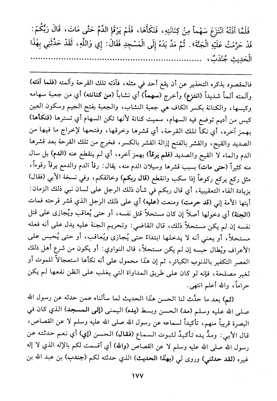 فَلَمَّا آذَتْهُ انْتَزَعَ سَهْمًا مِنْ كِنَانَتِهِ، فَنَكَأَهَا، فَلَمْ يَرْقَإِ الدَّمُ حَتَّى مَاتَ، قَال رَبُّكُمْ: قَدْ حَرَّمْتُ عَلَيهِ الْجَنَّةَ". ثُمَّ مَدَّ يَدَهُ إِلى الْمَسْجِدِ فَقَال: إِي وَاللهِ، لَقَدْ حَدَّثَنِي بِهذَا الْحَدِيثِ جُنْدَبٌ،