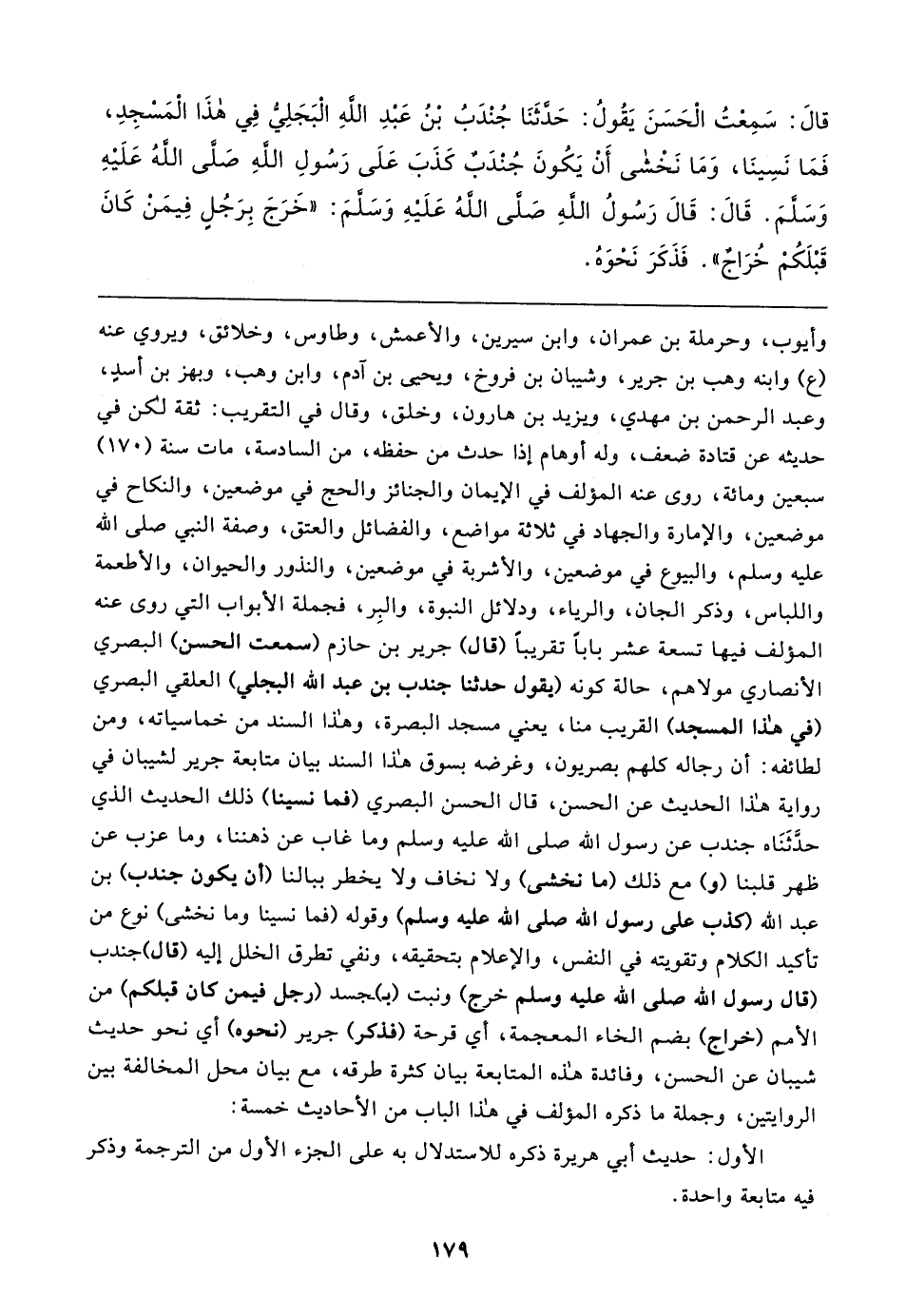 قال: سَمِعْتُ الْحَسَنَ يَقُولُ: حَدَّثَنَا جُنْدَبُ بْنُ عَبْدِ الله الْبَجَلِيُّ فِي هَذَا الْمَسْجِدِ، فَمَا نَسِينَا، وَمَا نَخْشى أَنْ يَكُونَ جُنْدَبٌ كَذَبَ عَلَى رَسُولِ الله صَلَّى اللهُ عَلَيهِ وَسَلَّمَ. قَال: قَال رَسُولُ الله صَلَّى اللهُ عَلَيهِ وَسَلَّمَ: "خَرَجَ بِرَجُلٍ فِيمَنْ كَانَ قَبْلَكُمْ خُرَاجٌ". فَذَكَرَ نَحْوَهُ