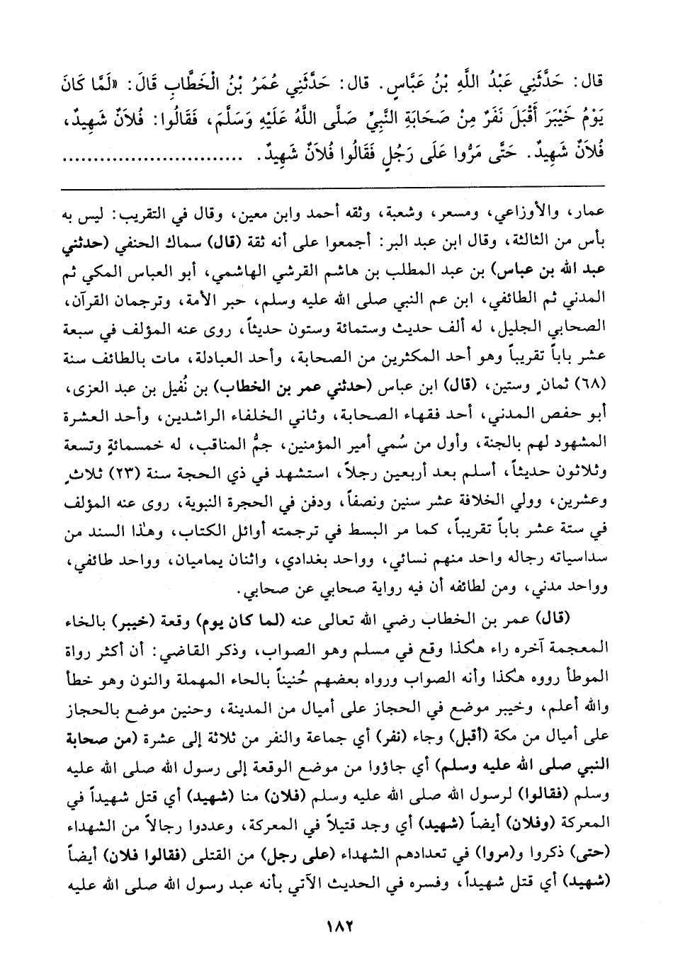 قال: حَدَّثَنِي عَبْدُ اللهِ بْنُ عَبَّاسٍ. قال: حَدَّثَنِي عُمَرُ بْنُ الْخَطَّابِ قَال: "لَمَّا كَانَ يَوْمُ خَيبَرَ أَقْبَلَ نَفَرٌ مِنْ صَحَابَةِ النَّبِيِّ صَلَّى اللهُ عَلَيهِ وَسَلَّمَ، فَقَالُوا: فُلانٌ شَهِيدٌ، فُلانٌ شَهِيدٌ. حَتَّى مَرُّوا عَلَى رَجُلٍ فَقَالُوا فُلانٌ شَهِيدٌ