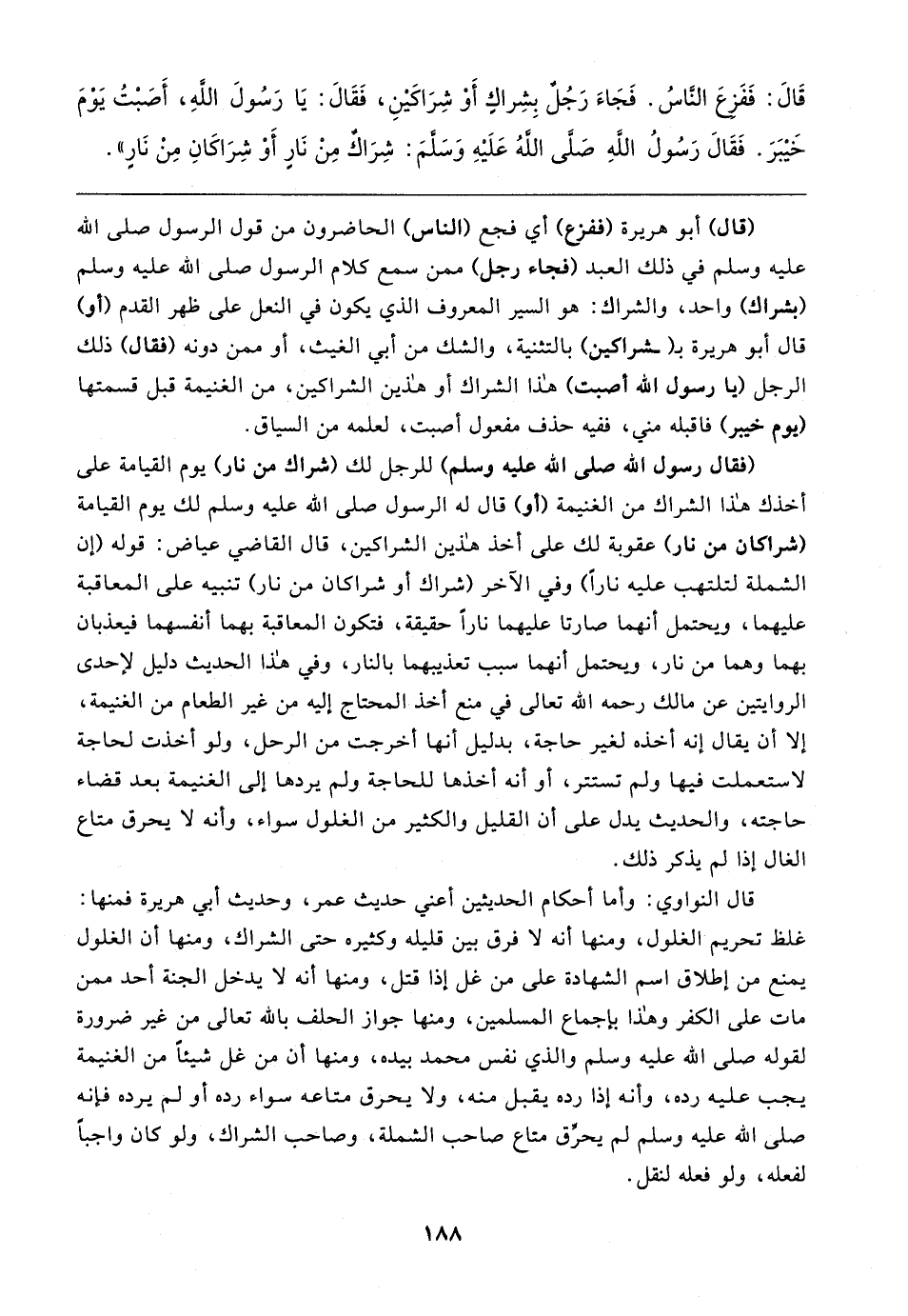 قَال: فَفَزِعَ النَّاسُ. فَجَاءَ رَجُلٌ بِشِراكٍ أَوْ شِرَاكَينِ، فَقَال: يَا رَسُولَ اللهِ، أَصَبْتُ يَوْمَ خَيبَرَ. فَقَال رَسُولُ اللهِ صَلَّى الله عَلَيهِ وَسَلَّمَ: شِرَاكٌ مِنْ نَارٍ أَوْ شِرَاكَانِ مِنْ نَارٍ"