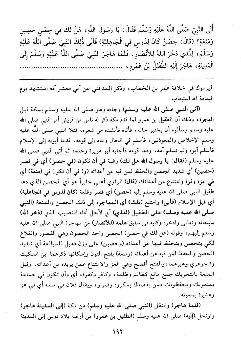 أَتَى النَّبِيَّ صَلَّى الله عَلَيهِ وَسَلَّمَ فَقَال: يَا رَسُولَ الله، هَلْ لَكَ فِي حِصْنٍ حَصِينٍ وَمَنَعَةٍ؟ (قَال: حِصْنٌ كَانَ لِدَوسٍ فِي الْجَاهِلِيَّةِ) فَأَبى ذلِكَ النَّبِيّ صَلَّى الله عَلَيهِ وَسَلَّمَ، لِلَّذِي ذَخَرَ الله لِلأَنْصارِ، فَلَمَّا هَاجَرَ النَّبِيّ صَلَّى الله عَلَيهِ وَسَلَّمَ إِلَى الْمَدِينَةِ، هَاجَرَ إِلَيهِ الطُّفَيلُ بْنُ عَمْروٍ،