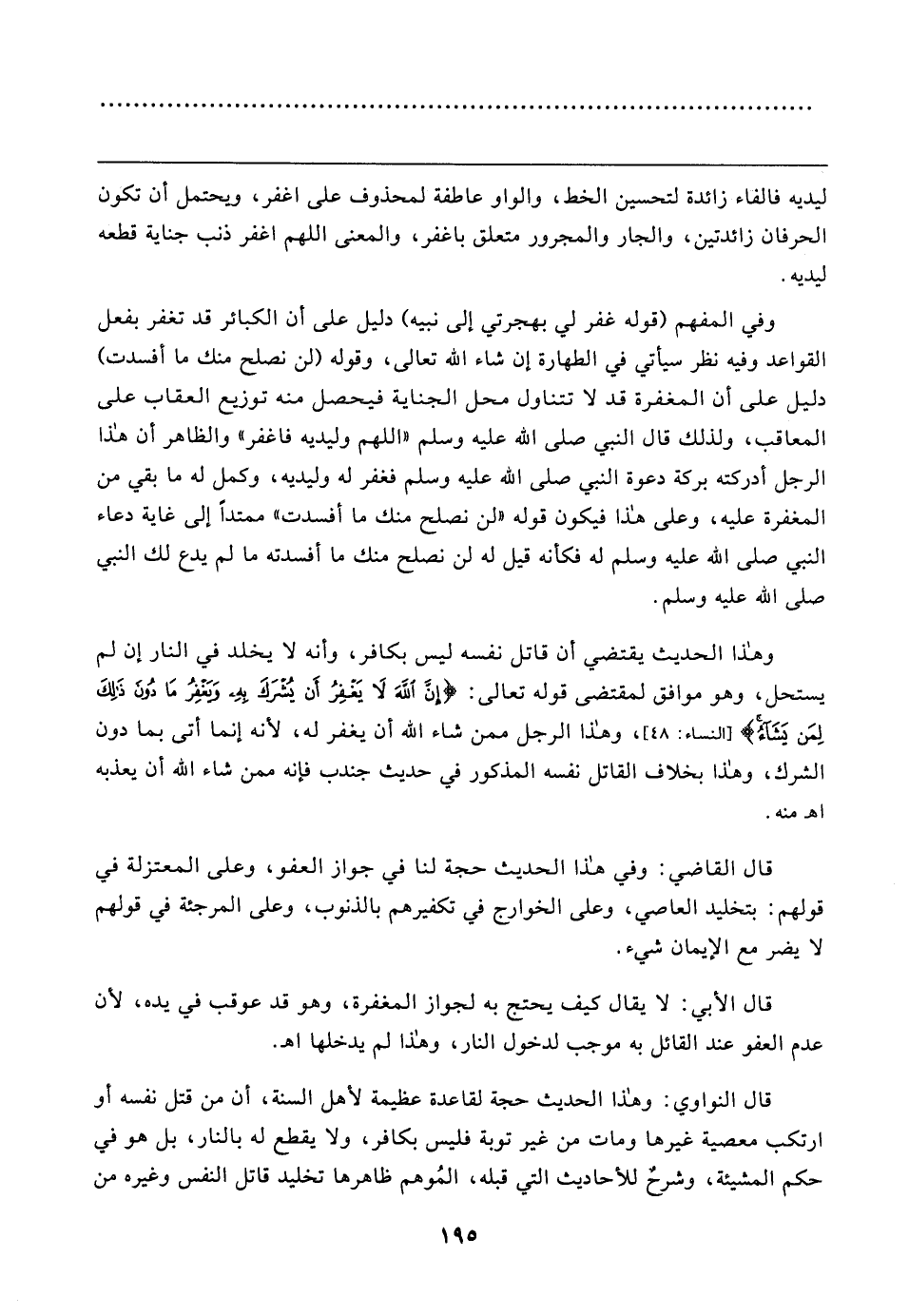 قال القاضي: وفي هذا الحديث حجة لنا في جواز العفو، وعلى المعتزلة في قولهم: بتخليد العاصي، وعلى الخوارج في تكفيرهم بالذنوب، وعلى المرجئة في قولهم لا يضر مع الإيمان شيء.