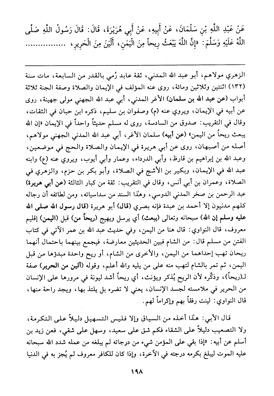الزهري مولاهم، أبو عبد الله المدني، ثقة عابد رُمي بالقدر من السابعة، مات سنة (١٣٢) اثنتين وثلاثين ومائة، روى عنه المؤلف في الإيمان والصلاة وصفة الجنة ثلاثة أبواب (عن عبد الله بن سلمان) الأغر المدني، أبي عبد الله الجهني مولى جهينة، روى عن أبيه في الإيمان، ويروي عنه (م) وصفوان بن سليم، ذكره ابن حبان في الثقات، وقال في التقريب: صدوق من السادسة، روى له مسلم حديثًا واحدًا في الإيمان "إن الله يبعث ريحًا من اليمن" (عن أبيه) سلمان الأغر، أبي عبد الله المدني الجهني مولاهم، أصله من أصبهان، روى عن أبي هريرة في الإيمان والصلاة والحج في موضعين، وعبد الله بن إبراهيم بن قارظ، وأبي الدرداء، وعمار وأبي أيوب، ويروي عنه (ع) وابنه عبد الله في الإيمان، وبكير بن الأشج في الصلاة، وأبو بكر بن حزم، والزهري في الصلاة، وعمران بن أبي أنس، وقال في التقريب: ثقة من كبار الثالثة (عن أبي هريرة) عبد الرحمن بن صخر المدني الدوسي، وهذا السند من سداسياته، ومن لطائفه أن رجاله كلهم مدنيون إلا أحمد بن عبدة فإنه بصري (قال) أبو هريرة (قال رسول الله صلى الله عليه وسلم إن الله) سبحانه وتعالى (يبعث) أي يرسل ويهيج (ريحًا من) قبل (اليمن) إقليم معروف، قال النواوي: قال هنا من اليمن، وفي حديث عبد الله بن عمر الآتي في كتاب الفتن من مسلم قال: من الشام فبين الحديثين معارضة، فيجمع بينهما باحتمال أنهما ريحان تهب إحداهما من اليمن، والأخرى من الشام، أو ريح واحدة مبدؤها من قبل اليمن، ثم تمر بالشام لتهب منه على من يليه والله أعلم، وقوله (ألين من الحرير) صفة لـ (ريحًا)، وذكَّره لأن الريح يُذكر ويؤنث، أي ريحًا أشد ليونة في مرورها على الإنسان من الحرير في ملامسته لجسد الإنسان، يعني لا تضره بل يلتذ بها، ويجد راحة منها، قال النواوي: لينت رفقًا بهم وإكرامًا لهم.