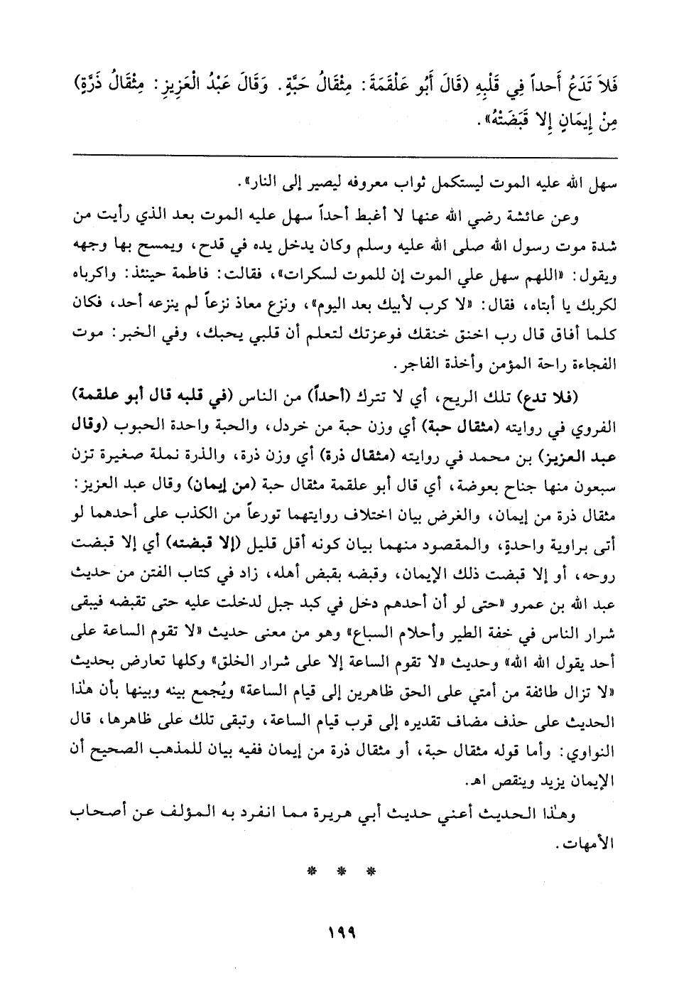 فَلَا تَدَعُ أَحدًا فِي قَلْبِهِ (قَال أَبُو عَلْقَمَةَ: مِثْقَالُ حَبَّةٍ. وَقَال عَبْدُ الْعَزِيزِ: مِثْقَالُ ذَرَّةٍ) مِنْ إِيمَانٍ إِلا قَبَضَتْهُ"