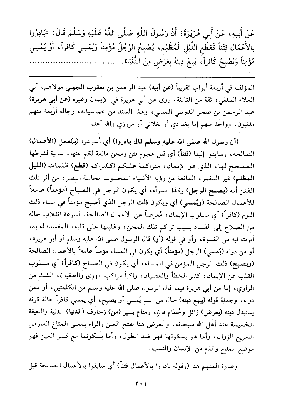 (أن رسول الله صلى الله عليه وسلم قال بادروا) أي أسرعوا (بـ) ـفعل (الأعمال) الصالحة، وسابقوا إليها (فتنًا) أي قبل هجوم فتن ومحن مانعة لكم عنها، سالبة لشرطها المصحح لها، الذي هو الإيمان، متراكمة عليكم (كـ) ـتراكم (قطع) ظلمات (الليل المظلم) غير المقمر، المانعة من رؤية الأشياء المحسوسة بحاسة البصر، من أثر تلك الفتن أنه (يصبح الرجل) وكذا المرأة، أي يكون الرجل في الصباح (مومنًا) عاملًا للأعمال الصالحة (ويُمسي) أي ويكون ذلك الرجل الذي أصبح مؤمنًا في مساء ذلك اليوم (كافرًا) أي مسلوب الإيمان، مُعرضًا عن الأعمال الصالحة، لسرعة انقلاب حاله من الصلاح إلى الفساد بسبب تراكم تلك المحن، وغلبتها على قلبه، المفسدة له بما أثرت فيه من القسوة، وأوفي قوله (أو) قال الرسول صلى الله عليه وسلم أو أبو هريرة، أو من دونه (يُمسي) الرجل (مومنًا) أي يكون في المساء مؤمنًا عاملًا بالأعمال الصالحة (ويصبح) ذلك الرجل المؤمن في المساء، أي يكون في الصباح (كافرًا) أي مسلوب القلب عن الإيمان، كثير الخطأ والعصيان، راكبًا مراكب الهوى والطغيان، الشك من الراوي، إما من أبي هريرة فيما قال الرسول صلى الله عليه وسلم من الكلمتين، أو ممن دونه، وجملة قوله (يبيع دينه) حال من اسم يُمسي أو يصبح، أي يمسي كافرًا حالة كونه يستبدل دينه (بعرض) زائل وحُطام فانٍ، ومتاع يسير (من) زخارف (الدنيا) الدنية والجيفة الخسيسة عند أهل الله سبحانه، والعرض هنا بفتح العين والراء بمعنى المتاع العارض السريع الزوال، وأما هو بسكونها فهو ضد الطول، وأما بسكونها مع كسر العين فهو موضع المدح والذم من الإنسان والنسب.