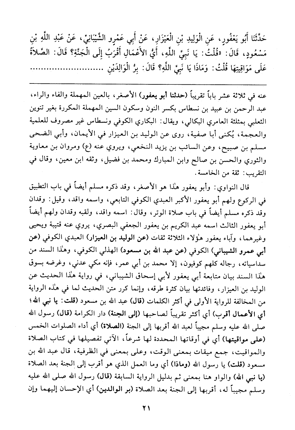 حَدَّثَنَا أَبُو يَعْفُورٍ، عَنِ الْوَلِيدِ بْنِ الْعَيزَارِ، عَنْ أَبِي عَمْرٍو الشَّيبَانِيِّ، عَنْ عَبْدِ اللهِ بْنِ مَسعودٍ، قَال: "قُلْتُ: يَا نَبِيَّ اللهِ، أَيُّ الأعمَالِ أَقْرَبُ إِلَى الْجنَّةِ؟ قَال: الصَّلَاةُ عَلَى مَوَاقِيتِهَا قُلْتُ: وَمَاذَا يَا نَبِيَّ اللهِ؟ قَال: بِرُّ الْوَالِدَينِ