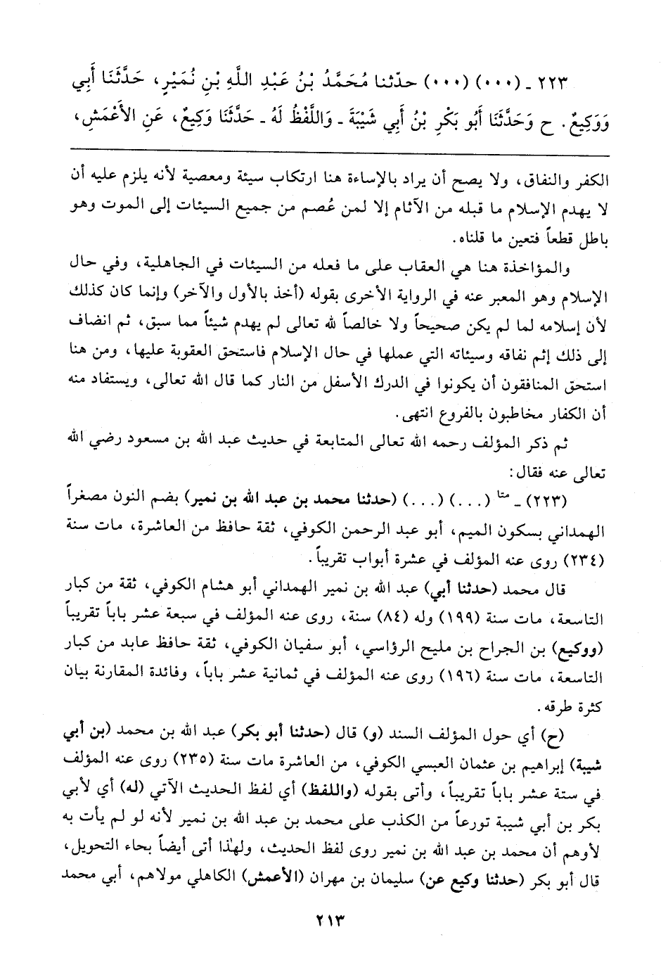 (٢٢٣) - متا (٠٠) (٠٠) (حدثنا محمد بن عبد الله بن نمير) بضم النون مصغرًا الهمداني بسكون الميم، أبو عبد الرحمن الكوفي، ثقة حافظ من العاشرة، مات سنة (٢٣٤) روى عنه المؤلف في عشرة أبواب تقريبًا.