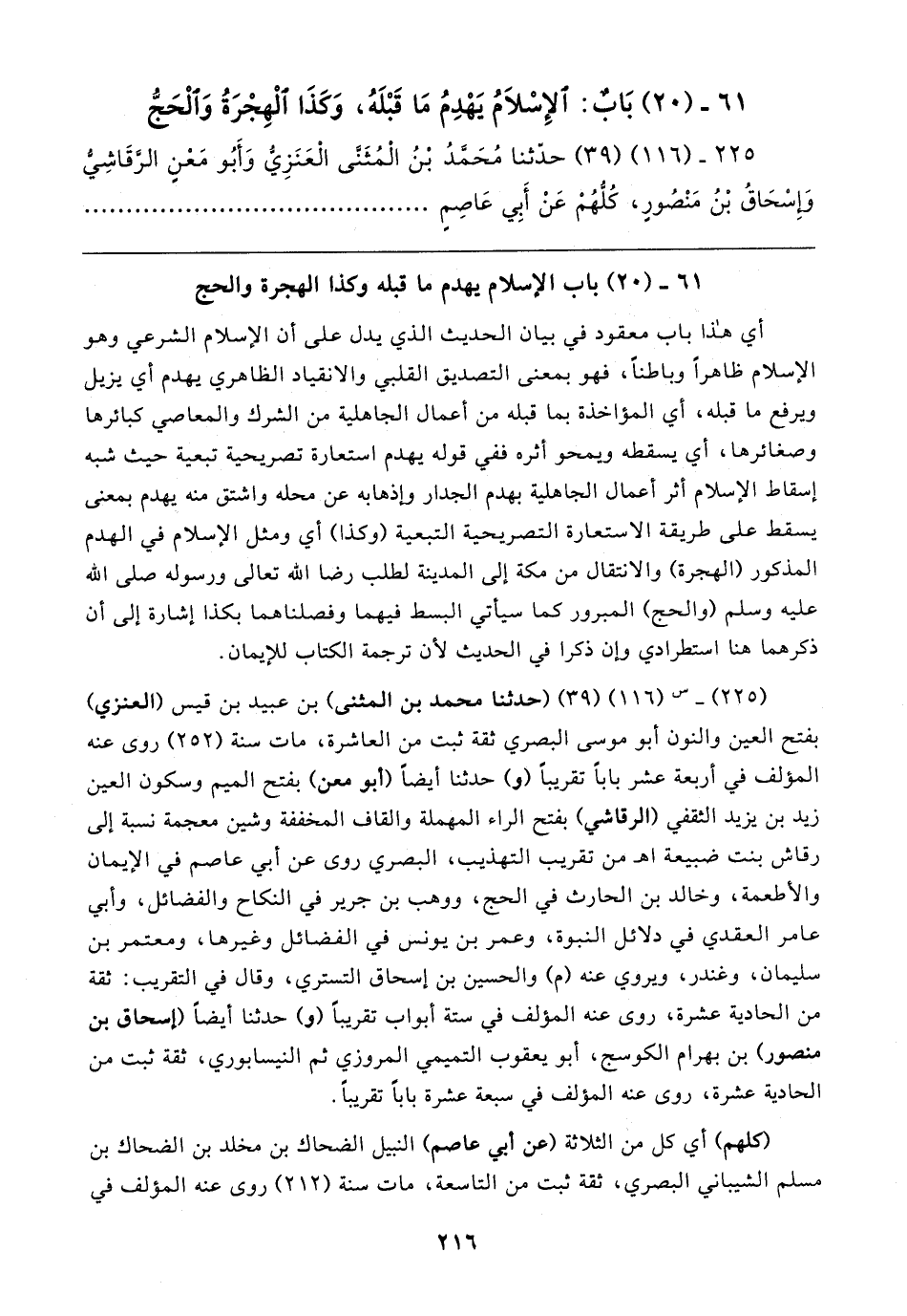 ٦١ - (٢٠) بَابٌ: الإِسْلامُ يَهْدِمُ مَا قَبْلَهُ، وَكَذَا الْهِجْرَةُ وَالْحَجُّ
