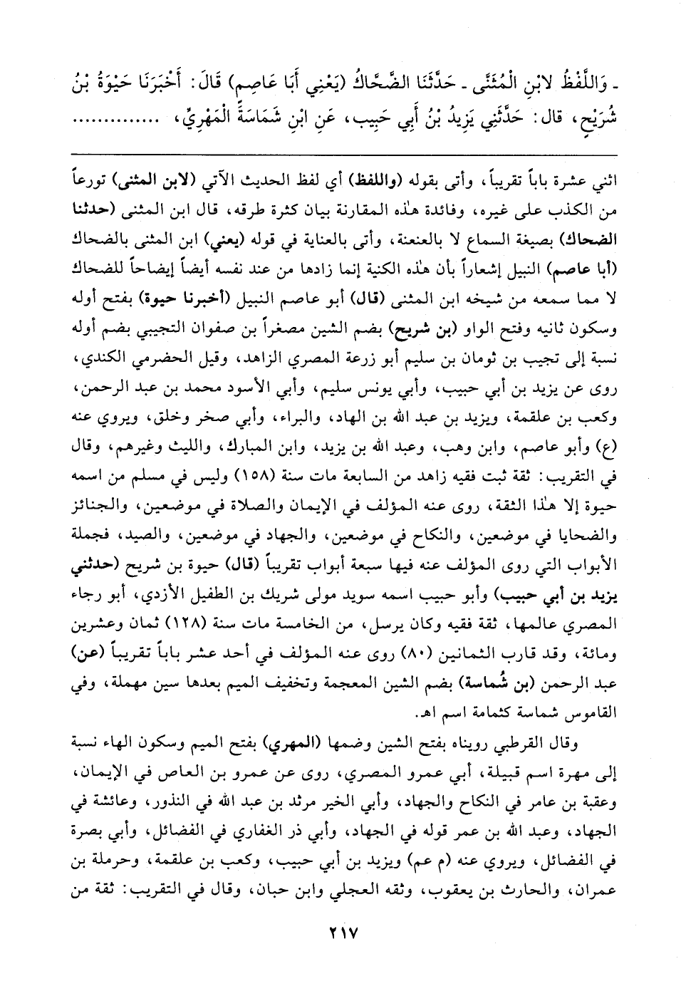 -وَاللَّفْظُ لابْنِ الْمُثَنَّى- حَدَّثَنَا الضَّحَّاكُ (يَعْنِي أَبَا عَاصِمٍ) قَال: أَخْبَرَنَا حَيوَةُ بْنُ شُرَيحٍ، قال: حَدَّثَنِي يَزِيدُ بْنُ أَبِي حَبِيب، عَنِ ابْنِ شَمَاسَةً الْمَهْرِيِّ،