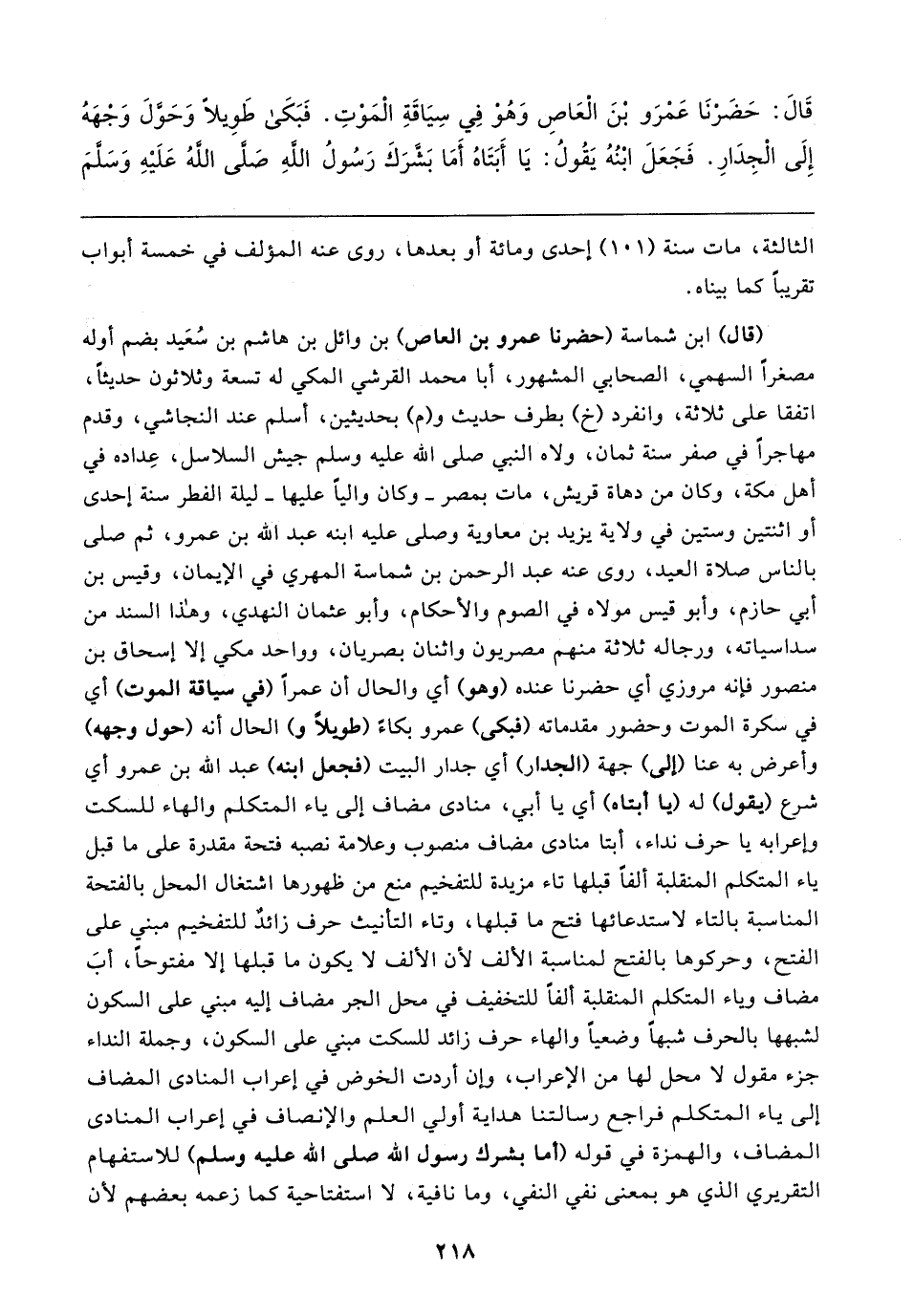 (قال) ابن شماسة (حضرنا عمرو بن العاص) بن وائل بن هاشم بن سُعَيد بضم أوله مصغرًا السهمي، الصحابي المشهور، أبا محمد القرشي المكي له تسعة وثلاثون حديثًا، اتفقا على ثلاثة، وانفرد (خ) بطرف حديث و (م) بحديثين، أسلم عند النجاشي، وقدم مهاجرًا في صفر سنة ثمان، ولاه النبي صلى الله عليه وسلم جيش السلاسل، عِداده في أهل مكة، وكان من دهاة قريش، مات بمصر -وكان واليًا عليها- ليلة الفطر سنة إحدى أو اثنتين وستين في ولاية يزيد بن معاوية وصلى عليه ابنه عبد الله بن عمرو، ثم صلى بالناس صلاة العيد، روى عنه عبد الرحمن بن شماسة المهري في الإيمان، وقيس بن أبي حازم، وأبو قيس مولاه في الصوم والأحكام، وأبو عثمان النهدي، وهذا السند من سداسياته، ورجاله ثلاثة منهم مصريون واثنان بصريان، وواحد مكي إلا إسحاق بن منصور فإنه مروزي أي حضرنا عنده (وهو) أي والحال أن عمرًا (في سياقة الموت) أي في سكرة الموت وحضور مقدماته (فبكى) عمرو بكاءً (طويلًا و) الحال أنه (حول وجهه) وأعرض به عنا (إلى) جهة (الجدار) أي جدار البيت (فجعل ابنه) عبد الله بن عمرو أي شرع (يقول) له (يا أبتاه) أي يا أبي، منادى مضاف إلى ياء المتكلم والهاء للسكت وإعرابه يا حرف نداء، أبتا منادى مضاف منصوب وعلامة نصبه فتحة مقدرة على ما قبل ياء المتكلم المنقلبة ألفًا قبلها تاء مزيدة للتفخيم منع من ظهورها اشتغال المحل بالفتحة المناسبة بالتاء لاستدعائها فتح ما قبلها، وتاء التأنيث حرف زائدٌ للتفخيم مبني على الفتح، وحركوها بالفتح لمناسبة الألف لأن الألف لا يكون ما قبلها إلا مفتوحًا، أبَ مضاف وياء المتكلم المنقلبة ألفًا للتخفيف في محل الجر مضاف إليه مبني على السكون لشبهها بالحرف شبهًا وضعيًا والهاء حرف زائد للسكت مبني على السكون، وجملة النداء جزء مقول لا محل لها من الإعراب، وإن أردت الخوض في إعراب المنادى المضاف إلى ياء المتكلم فراجع رسالتنا هداية أولي العلم والإنصاف في إعراب المنادى المضاف، والهمزة في قوله (أما بشرك رسول الله صلى الله عليه وسلم) للاستفهام التقريري الذي هو بمعنى نفي النفي، وما نافية، لا استفتاحية كما زعمه بعضهم لأن