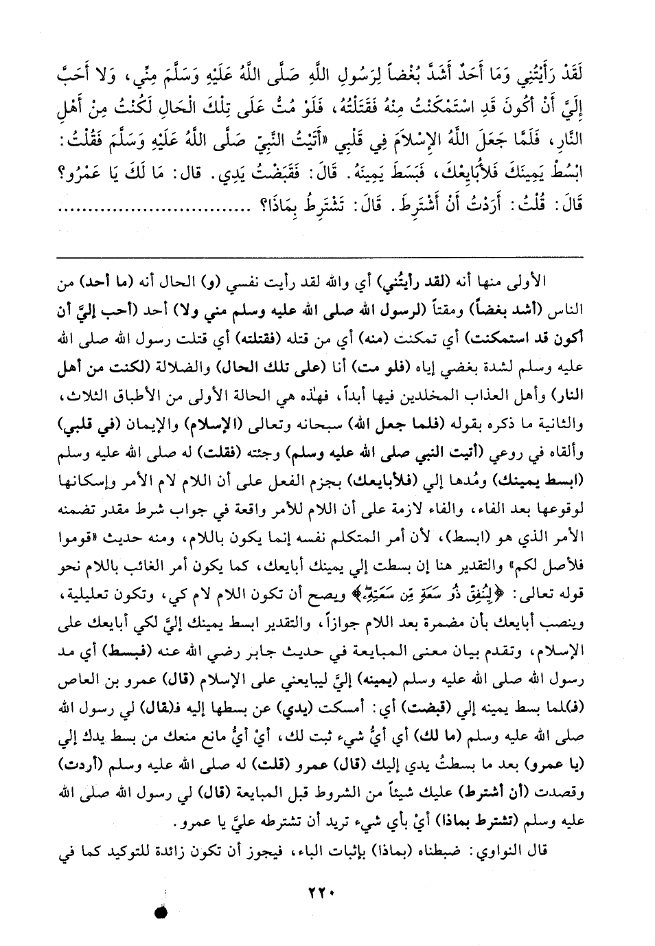 لَقَدْ رَأَيتُنِي وَمَا أَحَدْ أَشَذَ بُغْضًا لِرَسُولِ اللهِ صَلَّى اللهُ عَلَيهِ وَسَلَّمَ مِني، وَلا أَحَبَّ إِلَيَّ أَنْ أكُونَ قَدِ اسْتَمْكَنْتُ مِنْهُ فَقَتَلْتُهُ، فَلَوْ مُتُّ عَلَى تِلْكَ الْحَالِ لَكُنْتُ مِنْ أَهْلِ النَّارِ، فَلَمَّا جَعَلَ اللهُ الإِسْلامَ فِي قَلْبِي "أَتَيتُ النبِي صَلَّى اللهُ عَلَيهِ وَسَلَّمَ فَقُلتُ: ابْسُطْ يَمِينَكَ فَلأُبَايِعْكَ، فَبَسَطَ يَمِينَهُ. قَال: فَقَبَضْتُ يَدِي. قال: مَا لَكَ يَا عَمْرُو؟ قَال: قُلْتُ: أَرَدْتُ أَنْ أَشْتَرِطَ. قَال: تَشْتَرِطُ بِمَاذَا؟