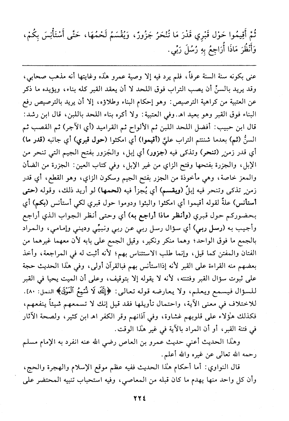 عنى بكونه سنة السنة عرفًا، فلم يرد فيه إلا وصية عمرو هذه وغايتها أنه مذهب صحابي، وقد يريد بالسنِّ أن يصب التراب فوق اللحد لا أن يعقد القبر كله بناء، ويؤيده ما ذكر عن العتبية من كراهية الترصيص: وهو إحكام البناء وطلاؤه، إلا أن يريد بالترصيص رفع البناء فوق القبر وهو بعيد اهـ. وفي العتبية: ولا أكره بناء اللحد باللبن، قال ابن رشد: قال ابن حبيب: أفضل اللحد اللبن ثم الألواح ثم القراميد (أي الآجر) ثم القصب ثم السنُّ (ثم) بعدما شننتم التراب عليَّ (أقيموا) أي امكثوا (حول قبري) أي جانبه (قدر ما) أي قدر زمنٍ (تنحر) وتذكى فيه (جزور) أي إبل، والجَزور بفتح الجيم التي تنحر من الإبل، والجزرة بفتحها وفتح الزاي من غير الإبل، وفي كتاب العين: الجزرة من الضأن والمعز خاصة، وهي مأخوذة من الجزر بفتح الجيم وسكون الزاي، وهو القطع، أي قدر زمنٍ تذكى وتنحر فيه إبلٌ (ويقسم) أي يُجزأ فيه الحمها) لو أريد ذلك، وقوله (حتى أستأنس) علةٌ لقوله أقيموا أي امكثوا والبثوا ودوموا حول قبري لكي أستأنس (بكم) أي بحضوركم حول قبري (وأنظر ماذا أراجع به) أي وحتى انظر الجواب الذي أراجع وأجيب به (رسل ربي) أي سؤال رسل ربي عن ربي ونبيِّي وديني وإمامي، والمراد بالجمع ما فوق الواحد؛ وهما منكر ونكير، وقيل الجمع على بابه لأن معهما غيرهما من الفتان والمفتن كما قيل، وإنما طلب الاستئناس بهم؛ لأنه أثبت له في المراجعة، وأخذ بعضهم منه القراءة على القبر لأنه إذا استأنس بهم فبالقرآن أولى، وفي هذا الحديث حجة على ثبوت سؤال القبر وفتنته، لأنه لا يقوله إلا بتوقيف، وعلى أن الميت يحيا في القبر للسؤال فيسمع ويعلم، ولا يعارضه قوله تعالى: {إِنَّكَ لَا تُسْمِعُ الْمَوْتَى} [النمل: ٨٠]. للاختلاف في معنى الآية، واحتمال تأويلها فقد قيل إنك لا تسمعهم شيئًا ينفعهم، فكذلك هؤلاء على قلوبهم غشاوة، وفي آذانهم وقر الكفر اهـ ابن كثير، ولصحة الآثار في فتنة القبر، أو أن المراد بالآية في غير هذا الوقت.